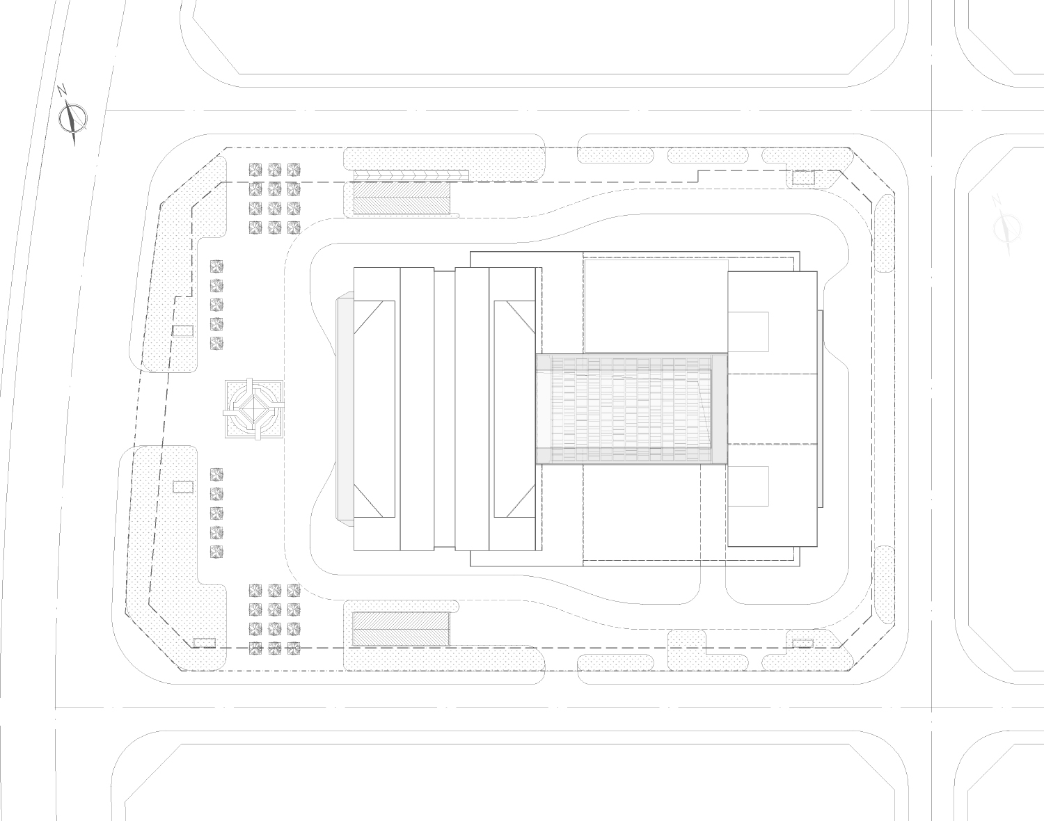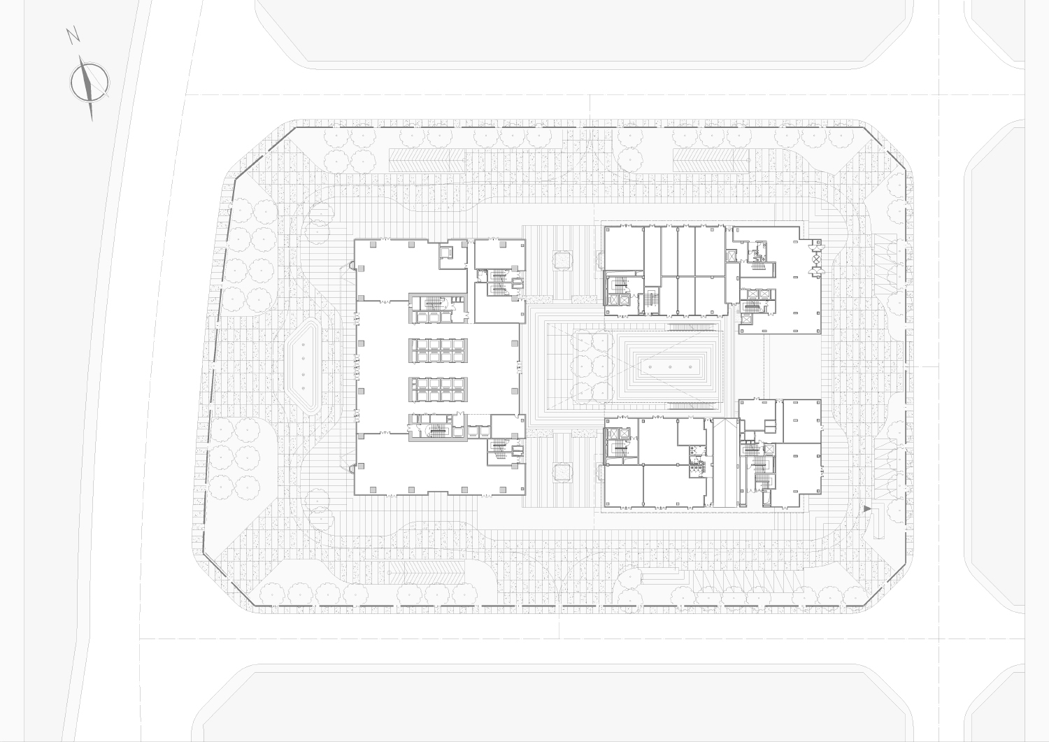 建筑依托場地西側(cè)天府公園的優(yōu)勢景觀,以中軸對稱的方式進(jìn)行建筑組合布局,矩形平面的辦公樓長邊正對公園景觀。項(xiàng)目80%的物業(yè)都能銜接到天府公園的景色,再加上頂部的市民觀光廊橋,建筑最大程度地利用了自然景觀。