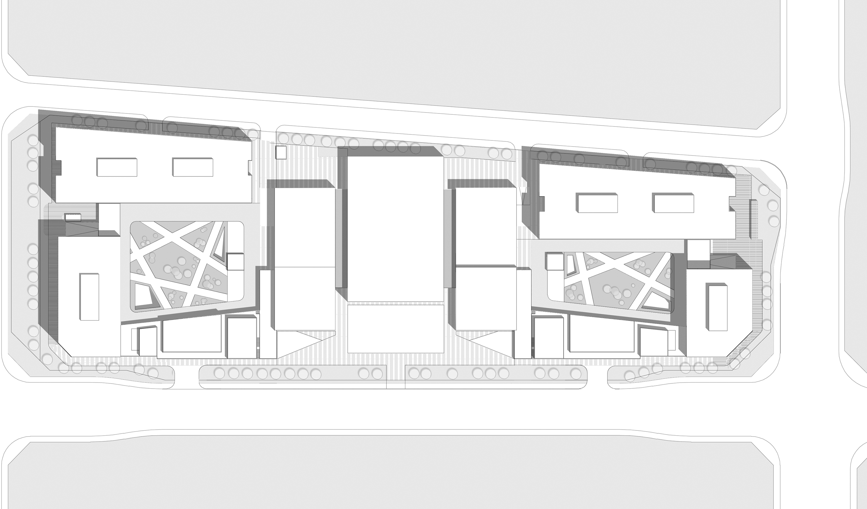 演播廳主體形象抽象于攝影機(jī),并采用開放演播廳的概念,形成以影視文化為主題的整理統(tǒng)一感。演播場(chǎng)館外立面構(gòu)思來(lái)源于虛幻的宇宙,并用顏色拼接漸變的手法,塑造出獨(dú)特的外表皮。辦公建筑采用同樣的星光主題,并抽象為演播廳的大型幕布背景,點(diǎn)綴絢麗星光,成為影視基地的第二道風(fēng)景線。商業(yè)建筑緊密貼合場(chǎng)館建筑設(shè)計(jì)風(fēng)格,并在流線上連接場(chǎng)館與辦公區(qū)域,以此構(gòu)建地塊的整體性。