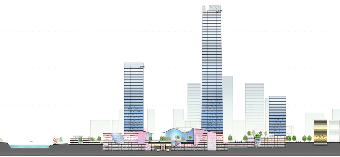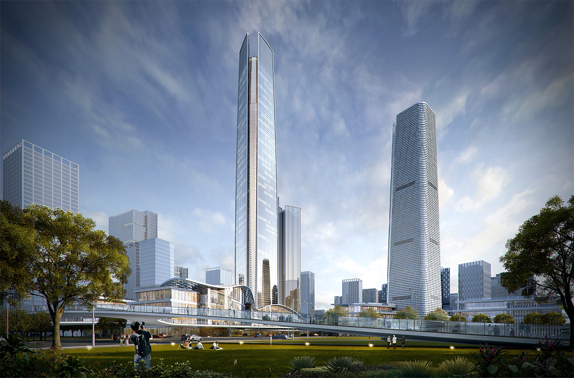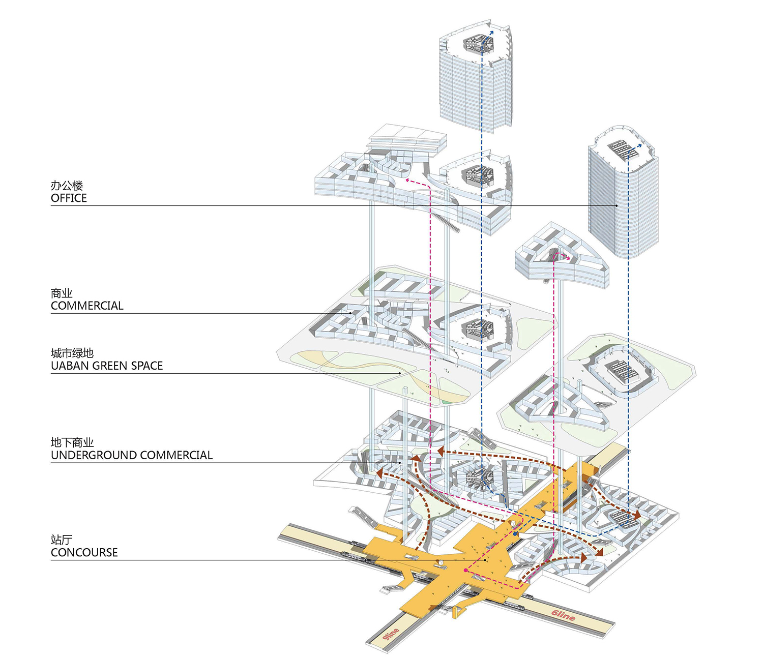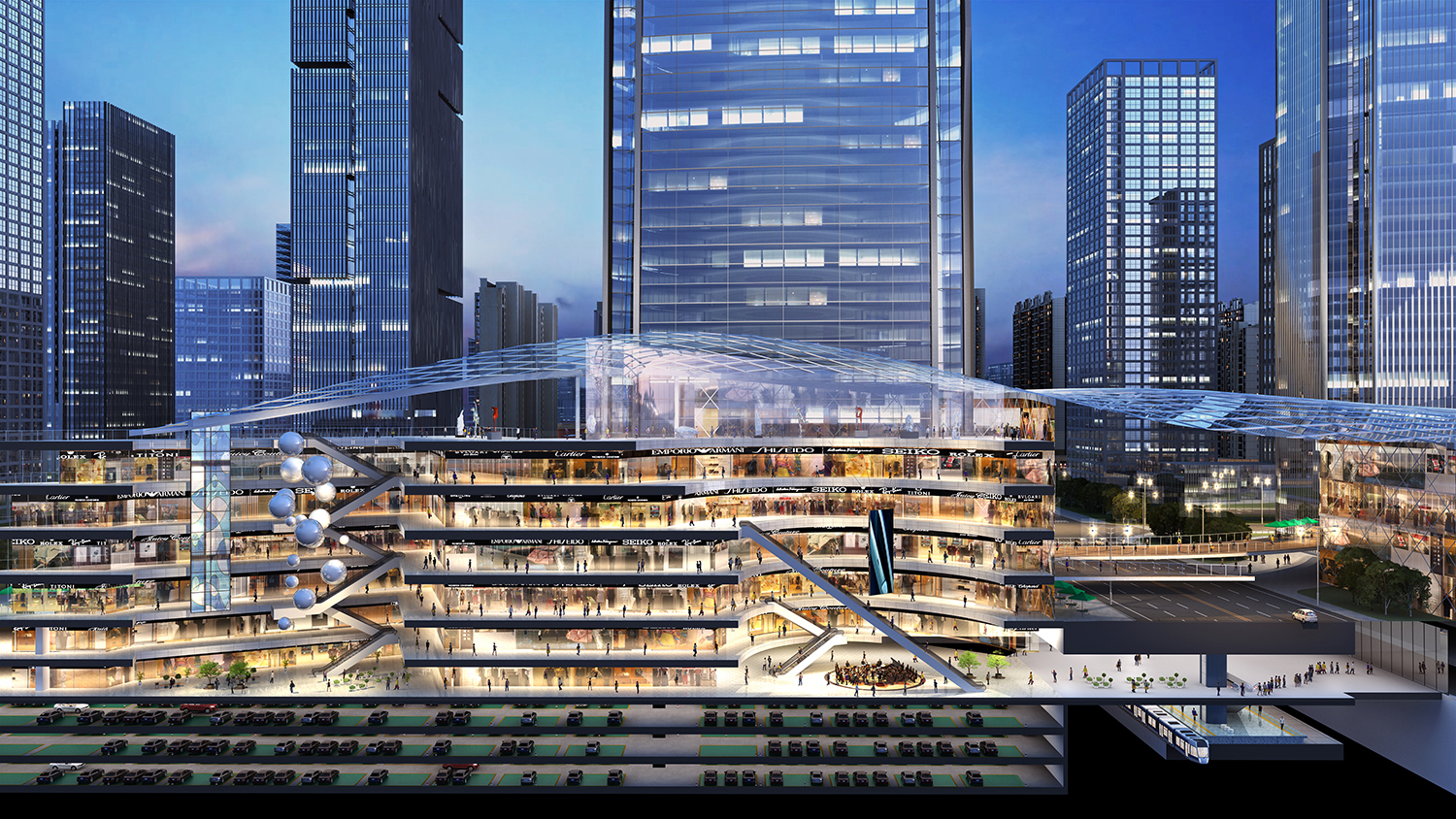 項目位于中央商務(wù)區(qū)核心地塊,著力打造以地鐵6號線及9號線交通優(yōu)勢為導(dǎo)向的中央商務(wù)區(qū),匯集了城市軌道交通、BRT、公交以及城市空中慢行系統(tǒng)等多種方式的立體交通體系。商業(yè)開發(fā)模式由原來的單一商業(yè)開發(fā)轉(zhuǎn)變?yōu)榧壍澜煌?、金融、商?wù)、辦公、居住、休閑娛樂為一體的TOD綜合開發(fā)模式。 項目區(qū)域內(nèi)軌道地下交通空間與各地塊相連,打破常規(guī)站廳層形象,行人可以從地鐵站廳層到達地下商業(yè),或者前往超高層辦公區(qū)域,也可通過飛天梯直達地上商業(yè)高區(qū)。地鐵站廳層設(shè)立藝術(shù)、生活及服務(wù)空間,與二層景觀廊橋結(jié)合,營造出一個集娛樂、休閑、文化、出行為一體的城市會客廳。