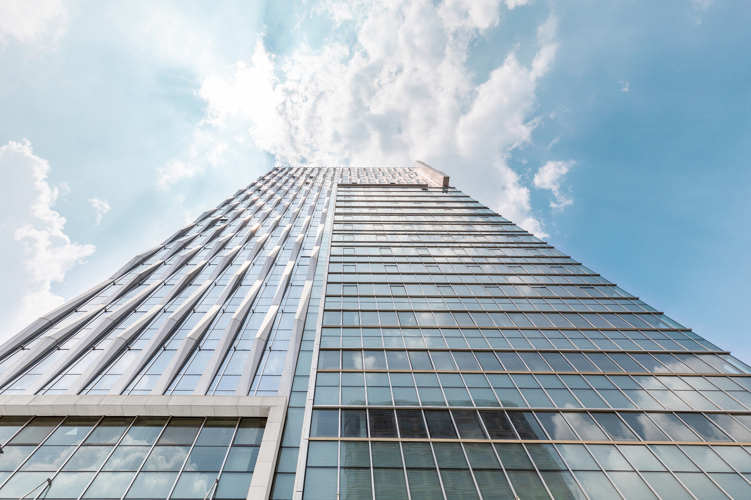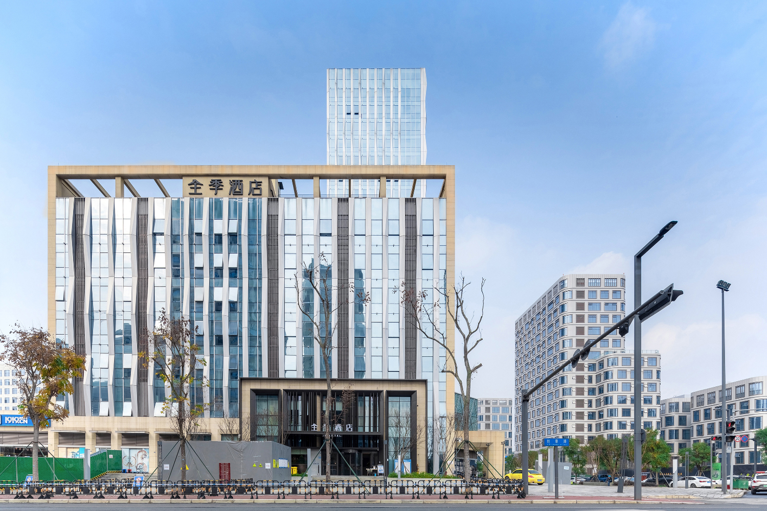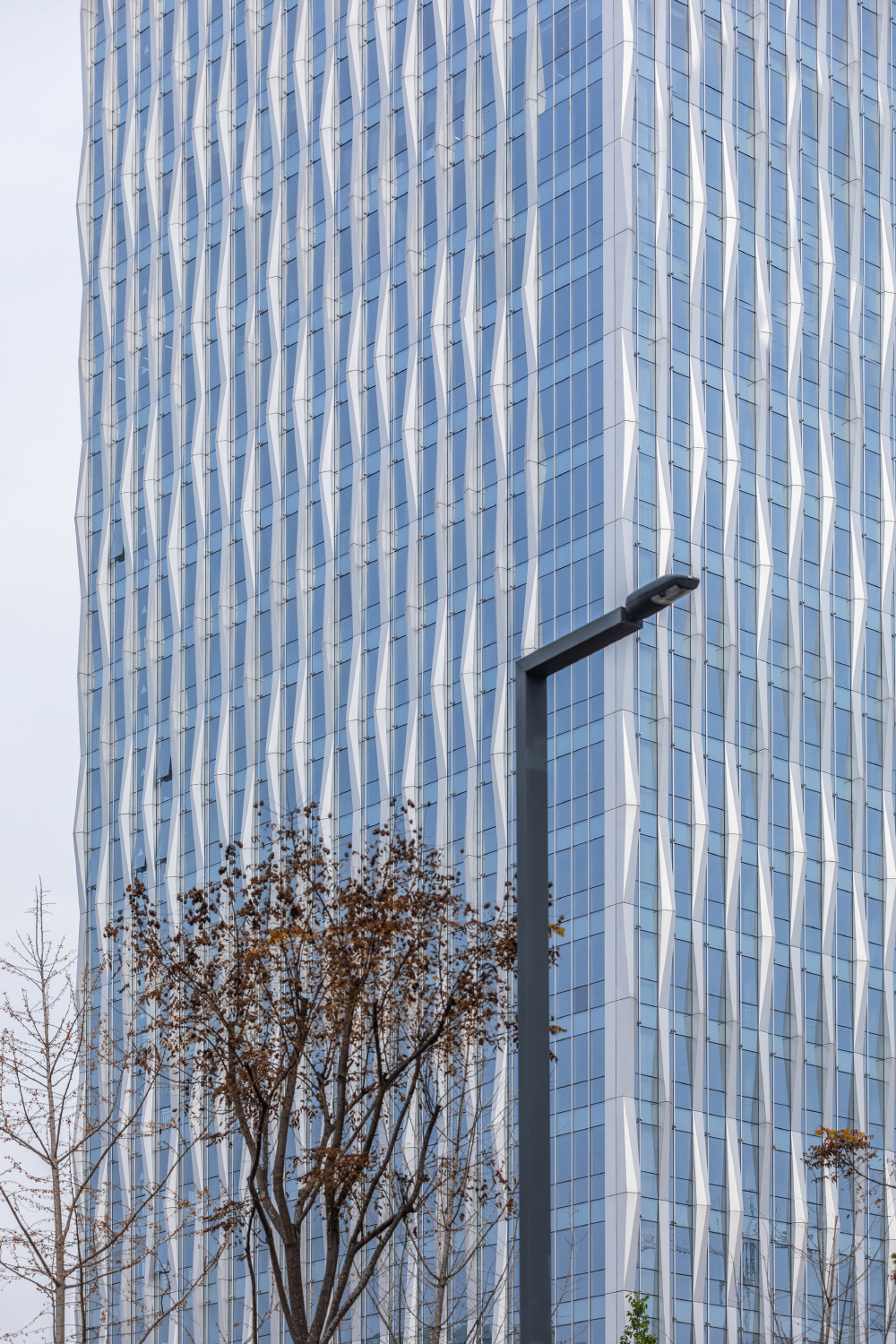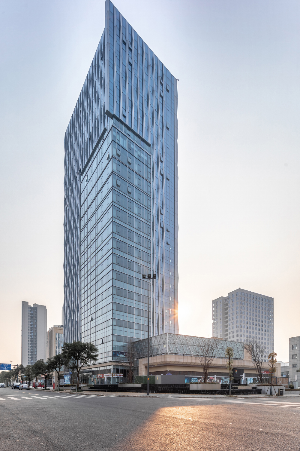 最高層辦公樓立面設計成抽象的水波紋路,將自然中的波浪律動融入建筑,與興隆湖形成對話。外墻結(jié)合玻璃、金屬等元素,通過橫豎線條的不同處理,強化了建筑的形式感,使建筑更加的挺拔,充滿張力。精簡的折疊線條和開窗方式的微妙變化,使得建筑立面現(xiàn)代又不失活潑。
