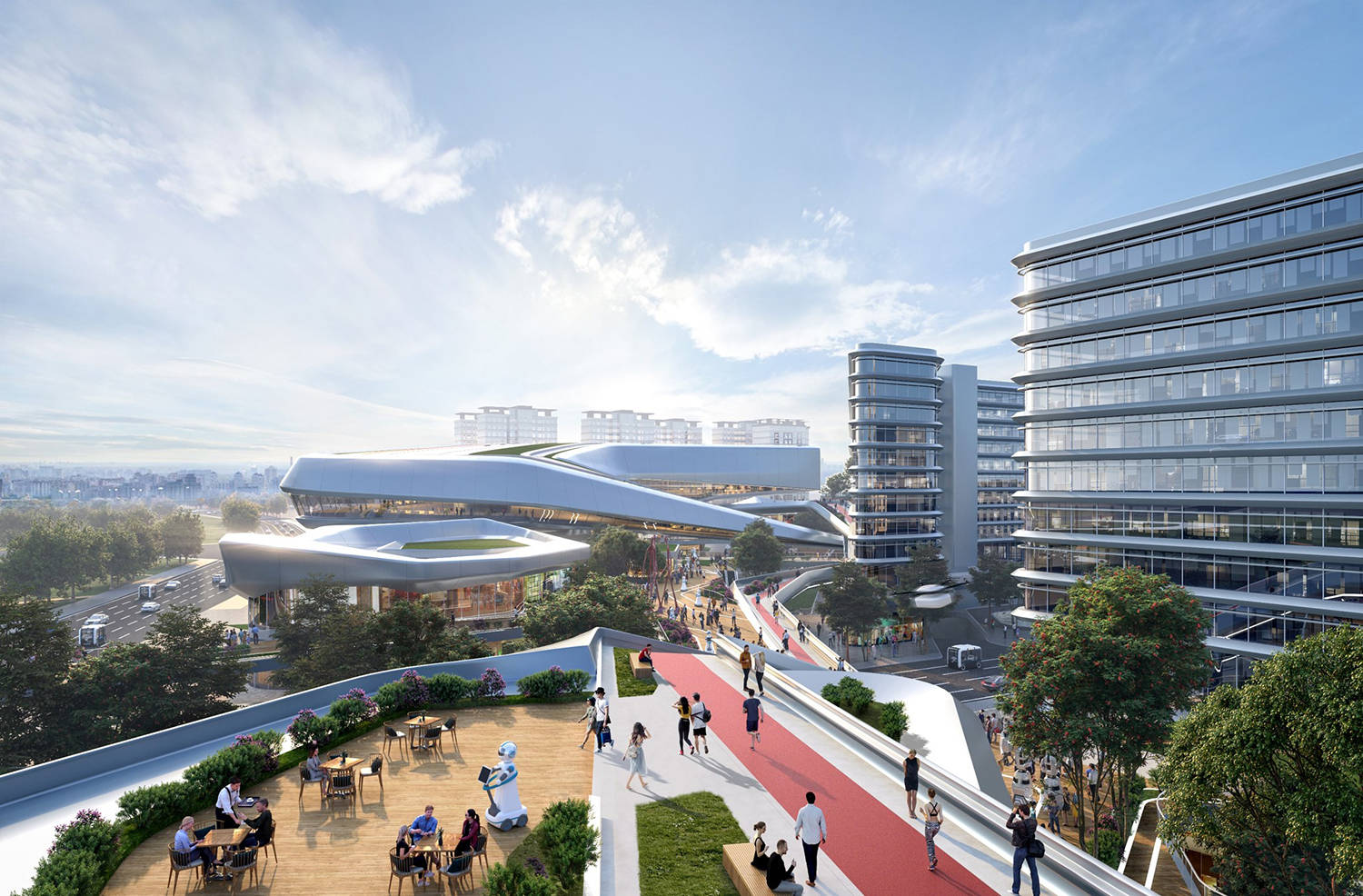 項目位于規(guī)劃中的成都雙流楊柳湖公園城市示范區(qū),距離成都雙流國際機(jī)場約為5.7千米,距市中心約19.5千米。根據(jù)創(chuàng)新空間的需求,將建筑空間切割分解為若干靈活空間,從而獲得更多商業(yè)展示面和更加自由的空間形態(tài)。通過二層連橋及平臺,將分散的商業(yè)服務(wù)空間鏈接起來,為各類人群提供靈活的公共交流空間。開放的公共空間、豐富的創(chuàng)意空間及合理的動線組織組成了智慧生活圈,將吸引更多人群,實現(xiàn)資源的共享。