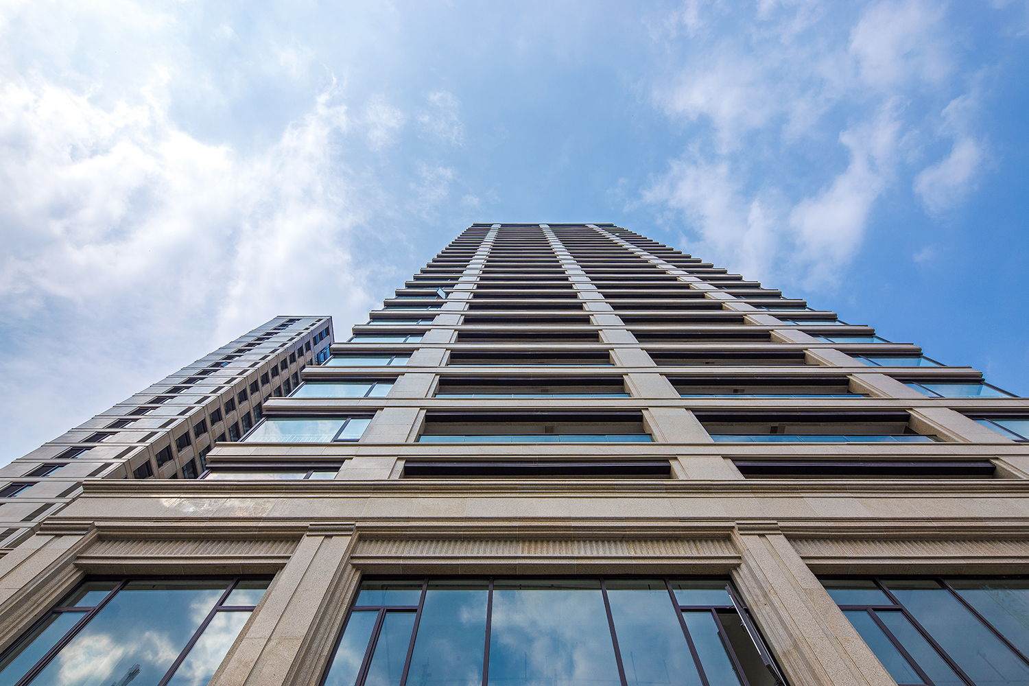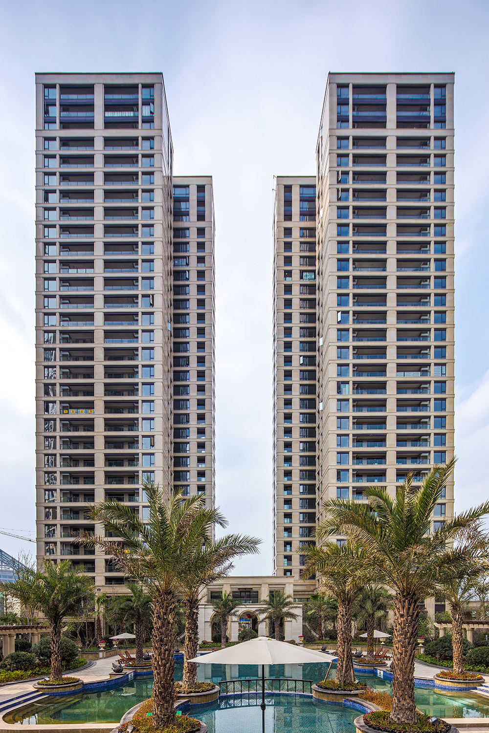 項目位于成都市南部新區(qū)石墻片區(qū),紅星路南延線西側,東南臨錦江,西北側鄰近新益州城市公園。項目立面采用清新典雅的新古典主義風格,強調橫向線條。高層住宅頂部三層采用整體通透的處理手法,底部采用厚重的體量處理手法,中段采用節(jié)制而生動的局部橫向線條,強化立面節(jié)奏和韻律,形成古典主義建筑經典的三段式做法,突出新古典主義建筑的比例之美。建筑風格在追求高尚住區(qū)的尊貴氣度的同時也兼顧與城市風貌的契合。沿街商業(yè)采用大開間布局,并置形成城市街道界面的韻律感。建筑細部及材質強調細部的比例協(xié)調,近黃金比例的洞口尺度,配以柱式和線腳的點綴與裝飾,在近人尺度上增加了建筑的豐富性。