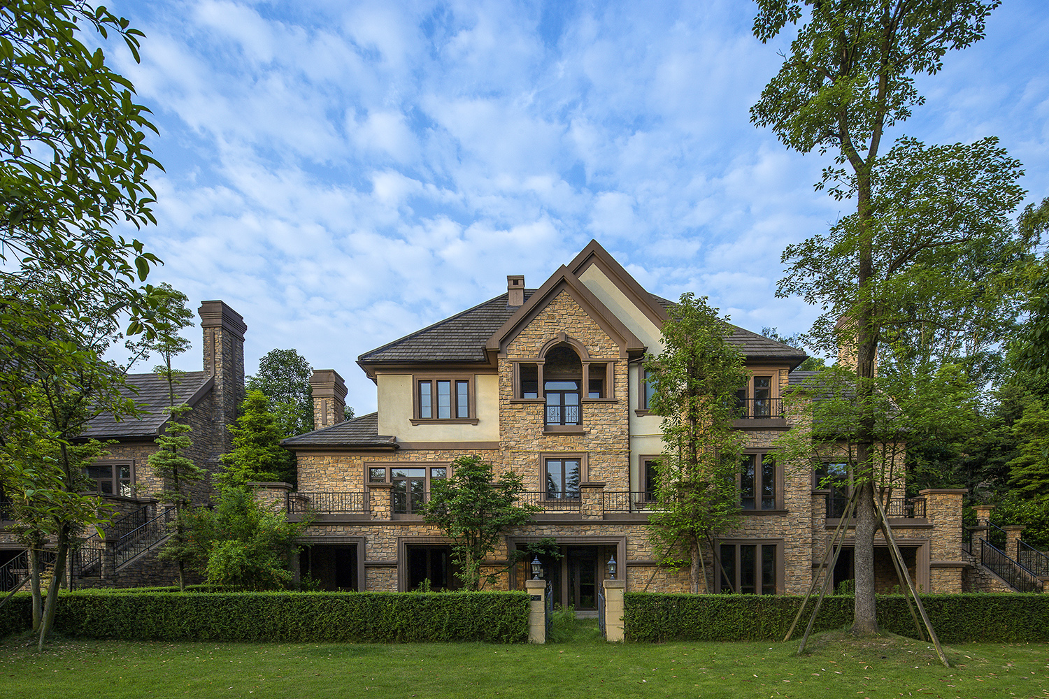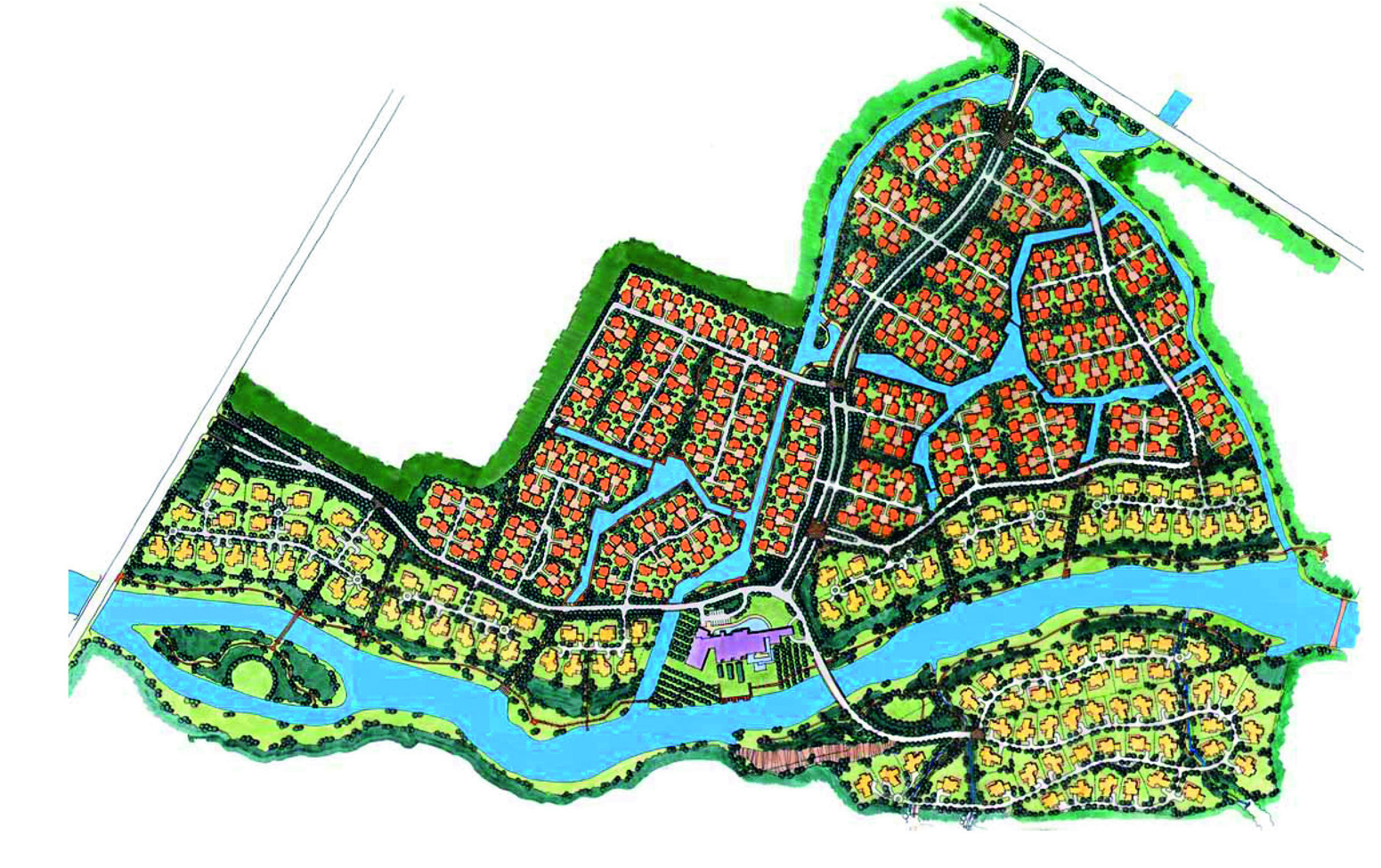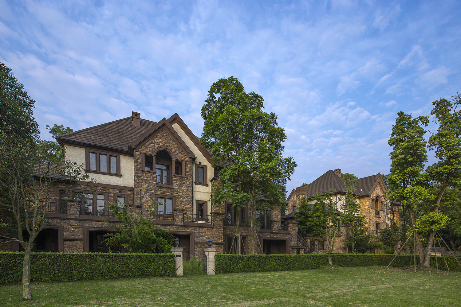 項目緊臨風(fēng)景優(yōu)美的牧馬山,擁有獨一無二的生態(tài)環(huán)境。設(shè)計始終強調(diào)生態(tài)社區(qū)感,營造人與自然的交流空間。項目采用傳統(tǒng)庭院式的布局,每幢別墅既有前院,又有內(nèi)庭和私家后花院。在總體規(guī)劃和建筑功能的設(shè)計上,參照北美式別墅建筑的現(xiàn)代風(fēng)格,形成組團式布置模式,每個組團的建筑的朝向均經(jīng)過精心考量,根據(jù)不同的景觀條件,設(shè)計不同的別墅類型,使得建筑與整體環(huán)境氛圍非常和諧。