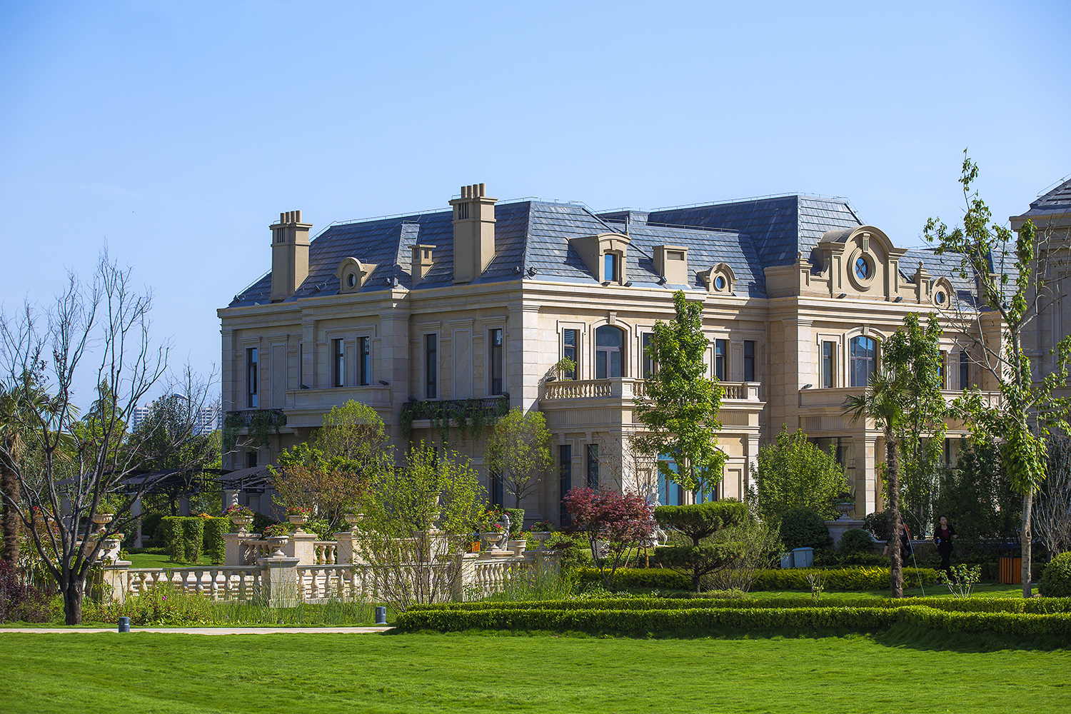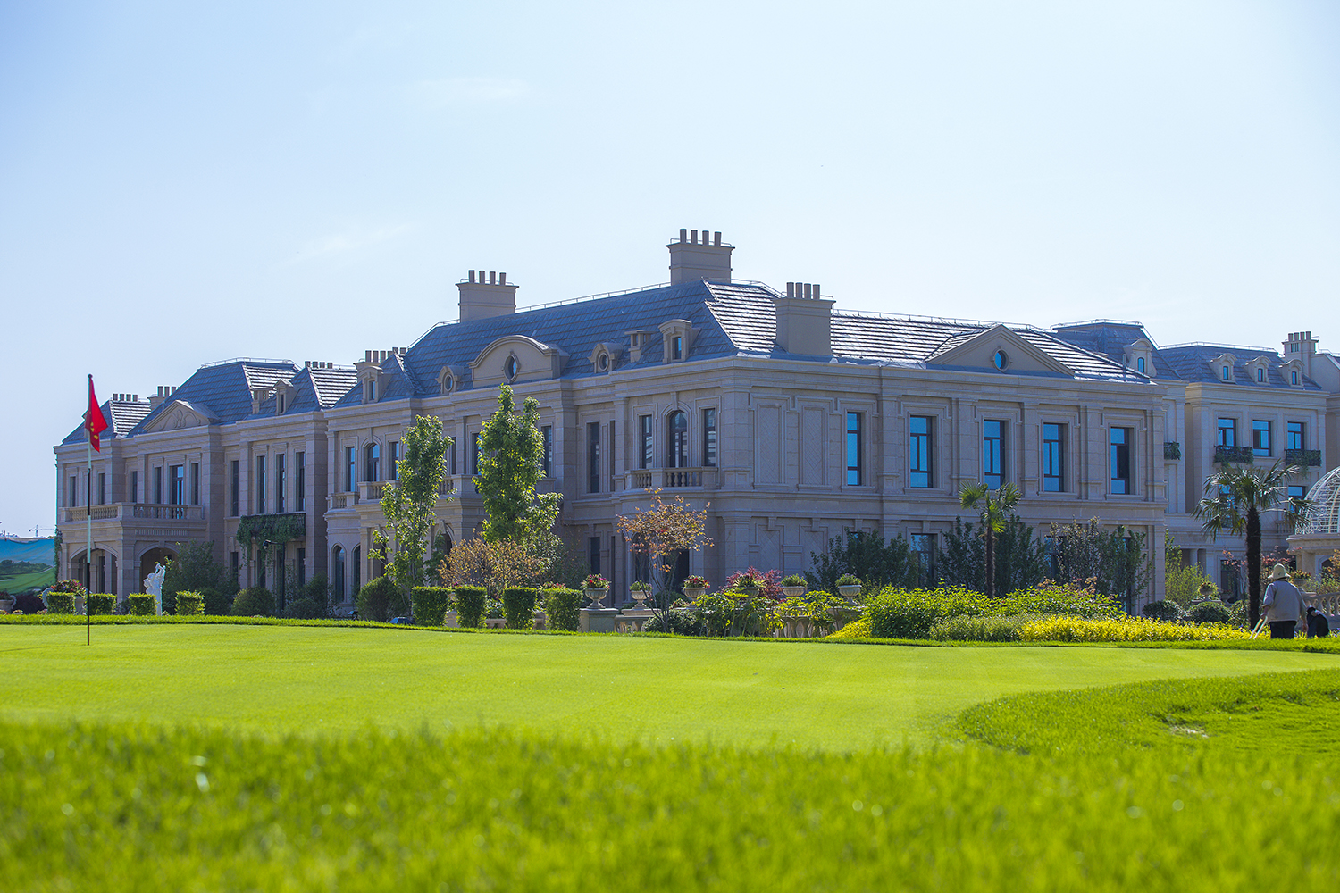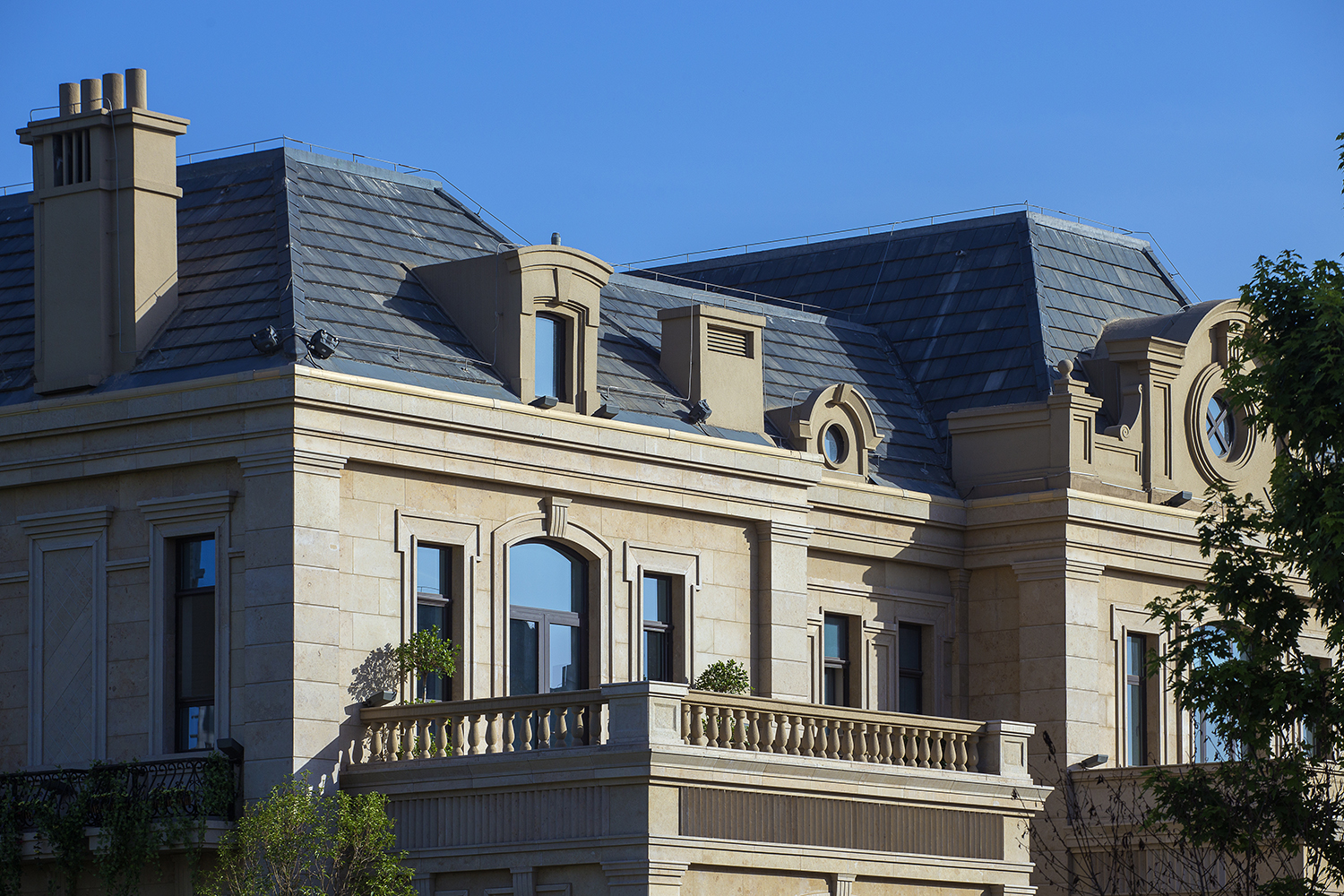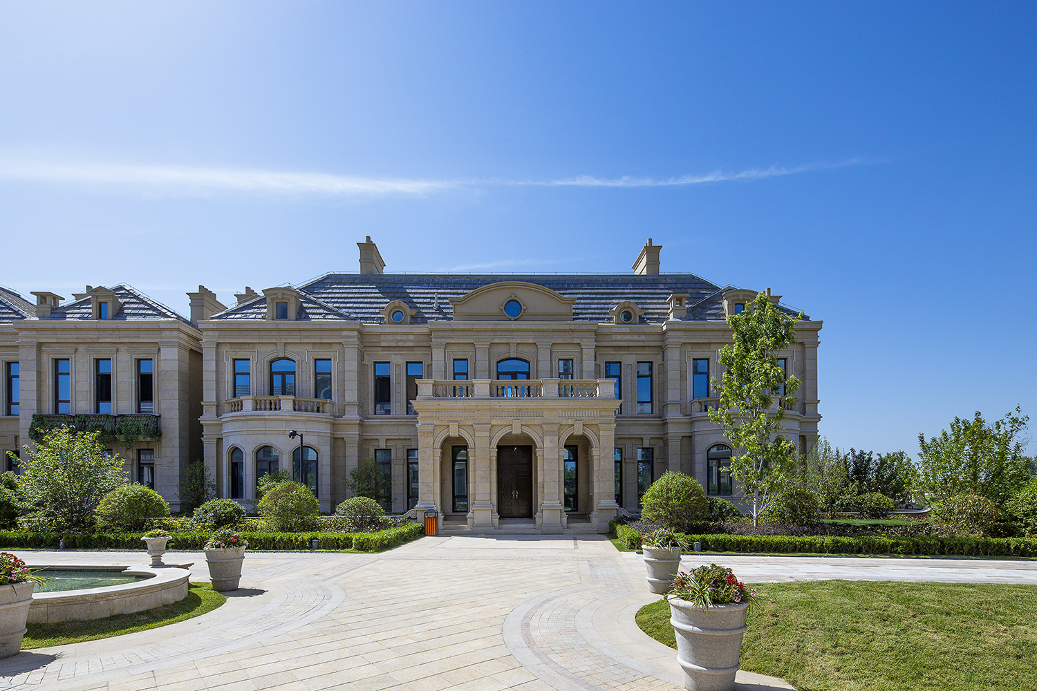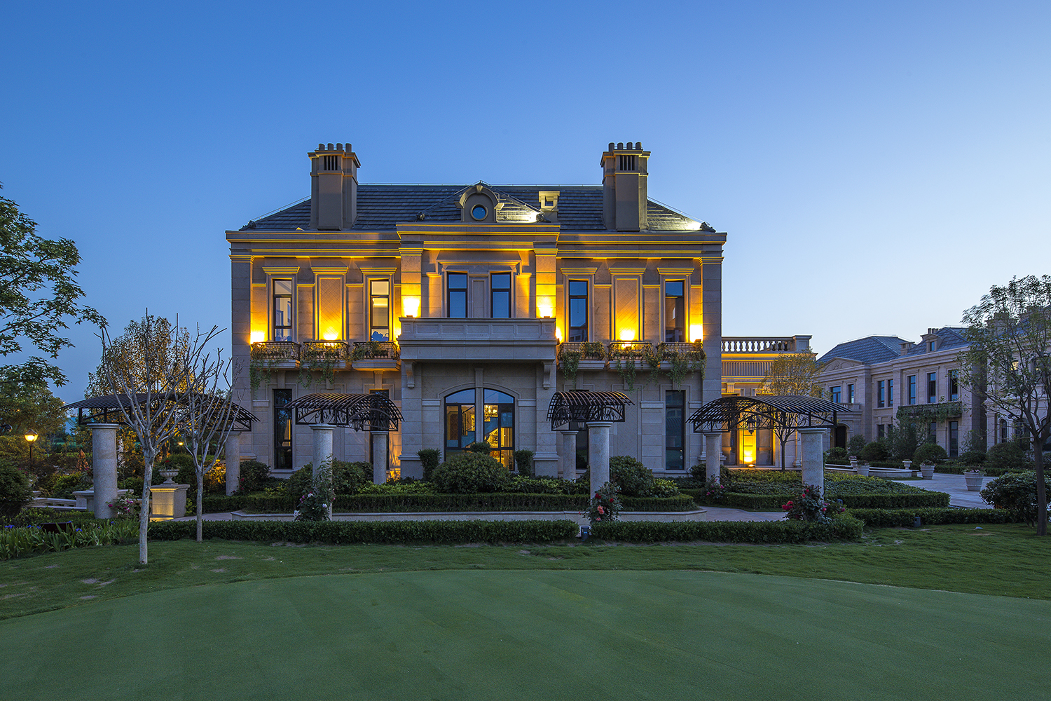 聯(lián)排式住宅有濃郁的西方古典風(fēng)格,設(shè)計(jì)通過巧妙的合院式組合,使得每戶都有充足的陽光及私家庭院。外墻采用干掛石材飾面,斜屋面為藍(lán)灰色波形瓦,點(diǎn)綴小區(qū)的尖塔,其浪漫氣息彰顯了樓盤與目標(biāo)客戶的品質(zhì)。