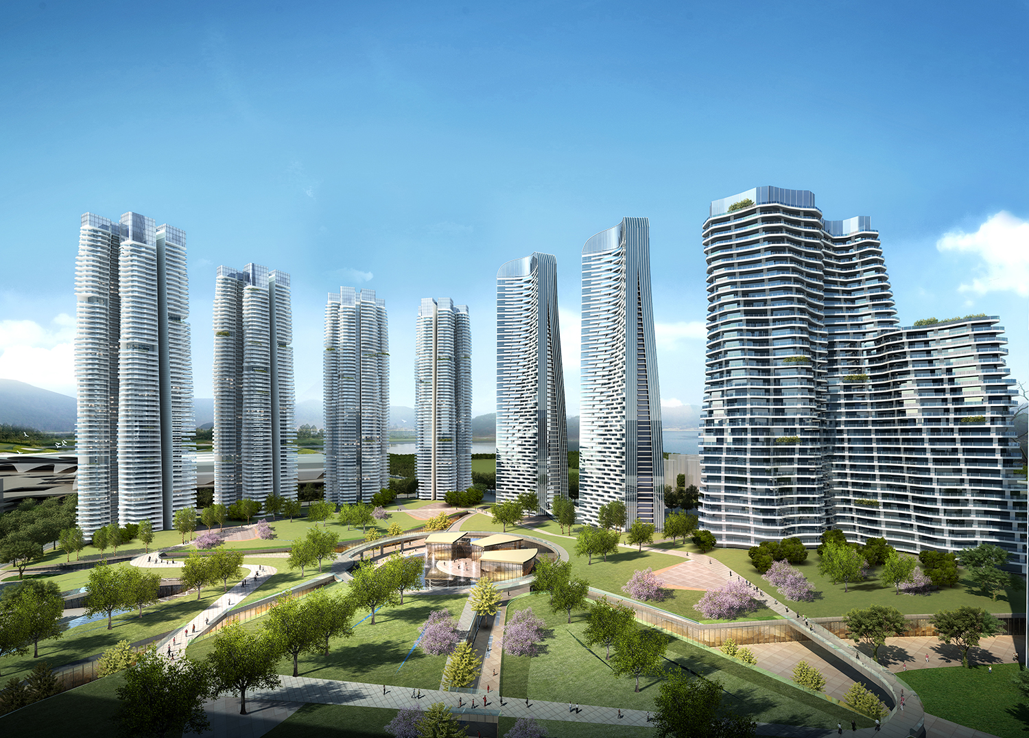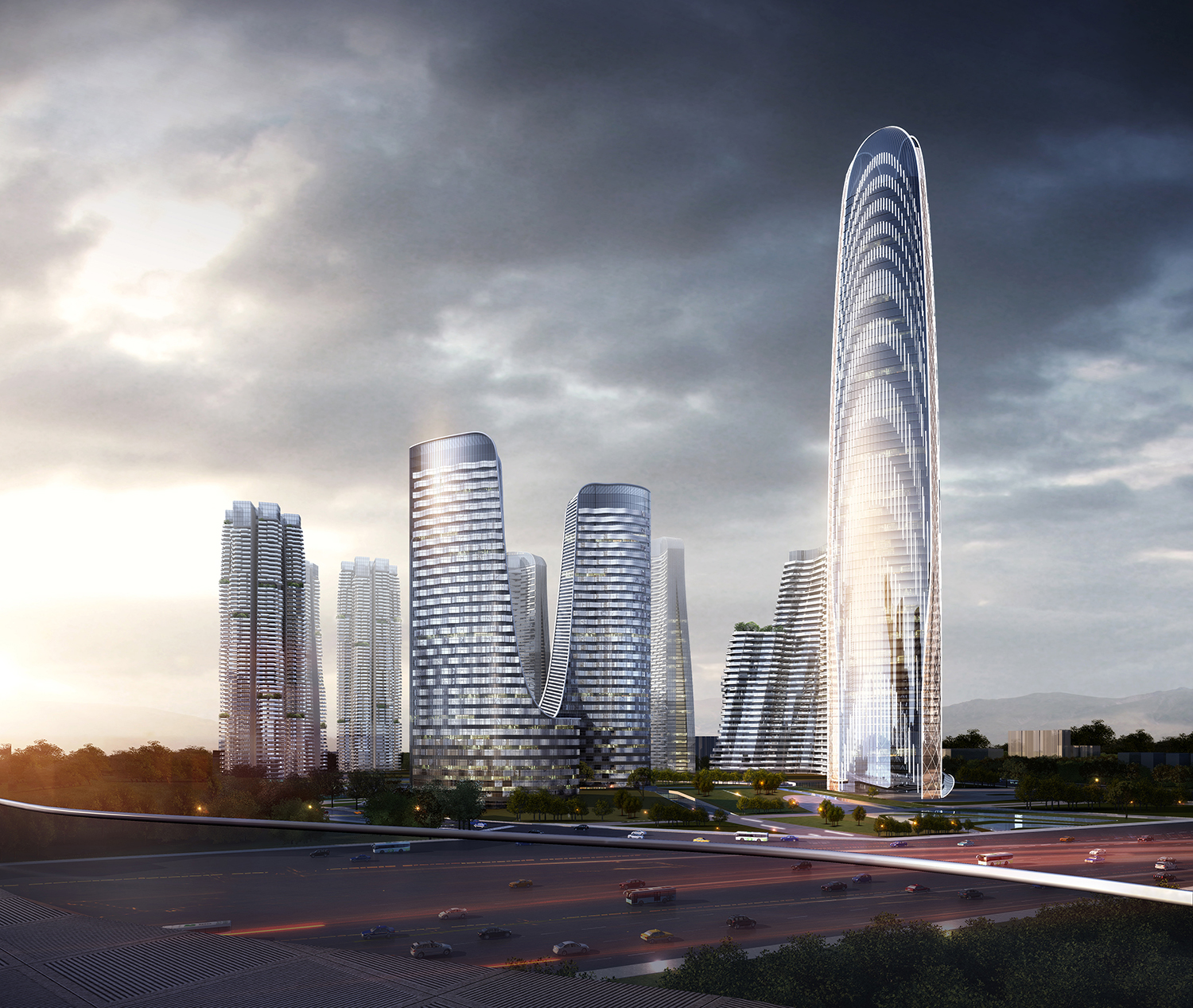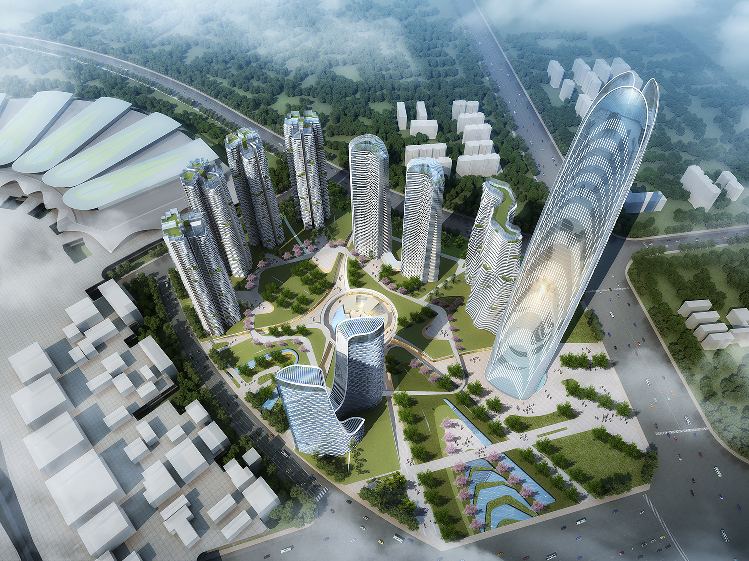 規(guī)劃理念:創(chuàng)建符合會展區(qū)域,利于城市形態(tài)展示的地標建筑形態(tài),形成高低搭配,錯落有致的城市空間;充分對接西側(cè)民俗商業(yè)街,南側(cè)海洋館,串聯(lián)濕地公園,打造開放式街區(qū);通過建筑斜向覆土化處理,無縫鏈接城市綠化體系打造中央公園,實現(xiàn)綠地面積最大化;利用塔式建筑分散布局于中央公園,最大化利用景觀視野,豐富城市天際形態(tài);塔樓錯落布置,互不遮擋,主要房間均朝向滇池及中央公園,充分利用景觀資源,最大化延長建筑景觀面;愿景:充分對接周邊城市功能,完善會展區(qū)域城市使命。