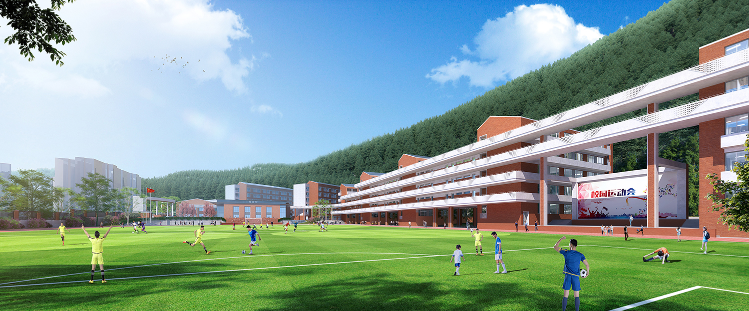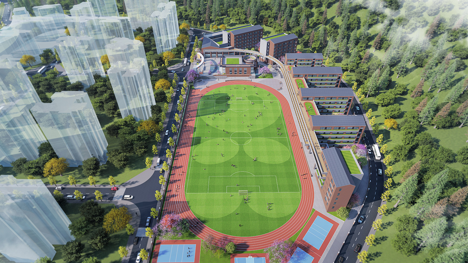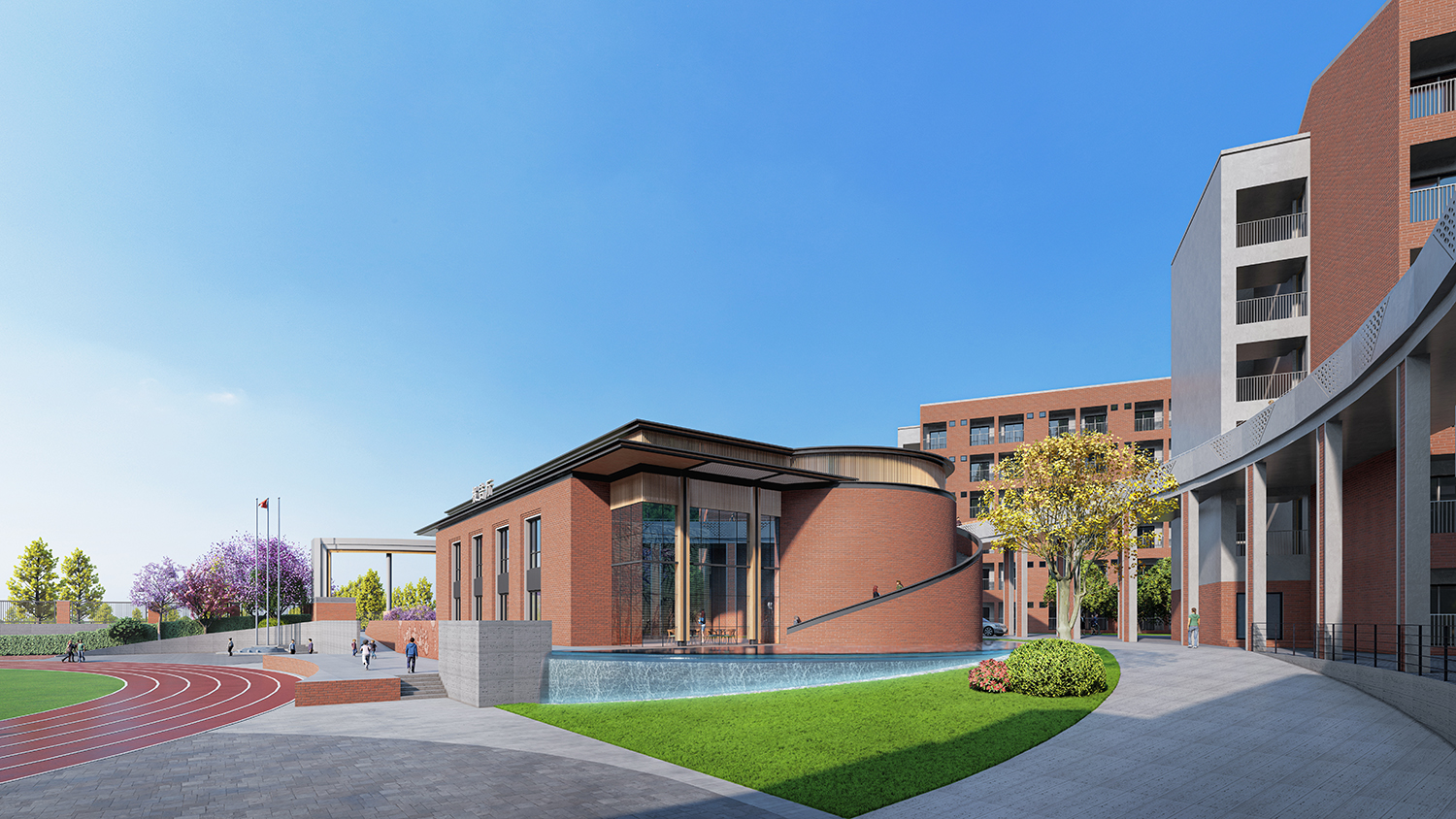 項(xiàng)目設(shè)計(jì)充分結(jié)合地域地形特點(diǎn),建筑以運(yùn)動(dòng)場(chǎng)地為中心呈半圍合式規(guī)劃布局,發(fā)射線(xiàn)式的空間布局形成井然有序的學(xué)??臻g序列。項(xiàng)目主要包含6棟多層建筑和一層地下車(chē)庫(kù),包括教學(xué)樓、圖書(shū)綜合館、行政辦公樓、學(xué)生宿舍、教師管理用房、風(fēng)雨操場(chǎng)等,均沿用地外側(cè)呈行列式布局,動(dòng)靜有序,界面舒朗。項(xiàng)目面對(duì)城市主界面設(shè)置運(yùn)動(dòng)場(chǎng)地形成開(kāi)闊空間,同時(shí)在城市主要道路主要轉(zhuǎn)角處設(shè)置對(duì)景建筑,與城市有機(jī)融合,和諧共生。首層利用局部架空為園區(qū)釋放出更多活動(dòng)空間,促進(jìn)師生活動(dòng)交流,同時(shí)也打開(kāi)了園區(qū)東西向視野,營(yíng)造出視野通透、豐富立體的空間品質(zhì)。,統(tǒng)一簡(jiǎn)潔的橫向欄桿線(xiàn)條讓校園具有韻律感,磚紅色及米白色相間形成建筑的虛實(shí)對(duì)比和體塊關(guān)系,展現(xiàn)了一個(gè)優(yōu)雅的校園風(fēng)情園區(qū)。