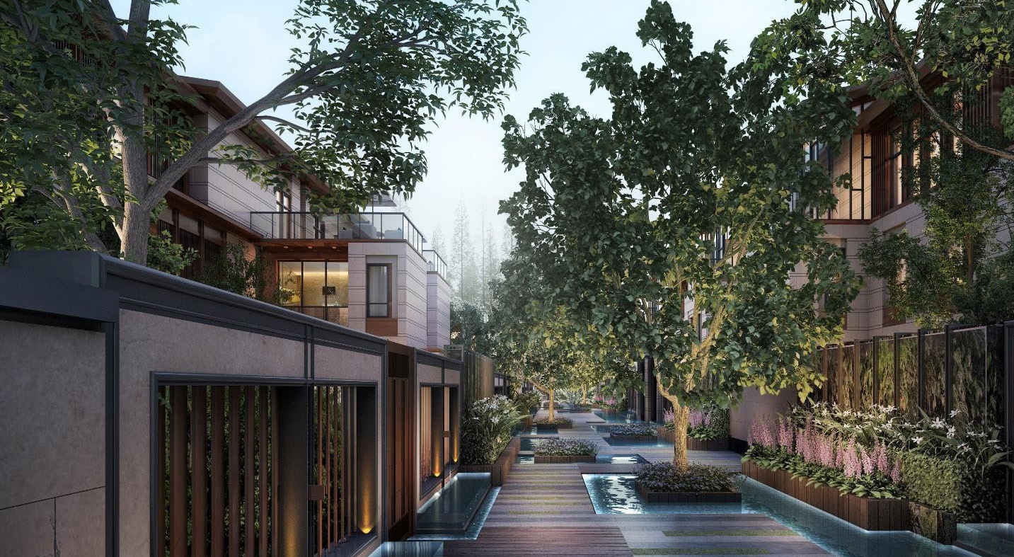 項(xiàng)目整體規(guī)劃上利用東西軸線,串聯(lián)各空間組團(tuán)。“東方景觀軸”基于東方園林藝術(shù),通過(guò)庭院層次、空間收方、山光潭影、堆山疊石等元素,結(jié)合觀者思想內(nèi)涵,修身養(yǎng)性?!拔鞣蕉Y儀軸”重視不同景觀組合,盡顯大氣與奢華,給予行人良好的步行體驗(yàn)。整體上即融合了東方傳統(tǒng)建筑之美,也糅合了西方建筑的精致。