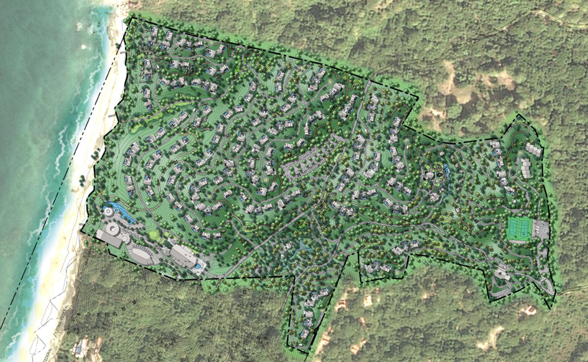 六善塞尤利塔是一家仿佛未被開發(fā)的,但卻是成熟的坐落在起伏叢林中的豪華度假村。該地向西通向一片優(yōu)質(zhì)隱秘的公共海灘。項目設(shè)計根據(jù)地形條件,確定了瞭望點和優(yōu)質(zhì)景觀。
