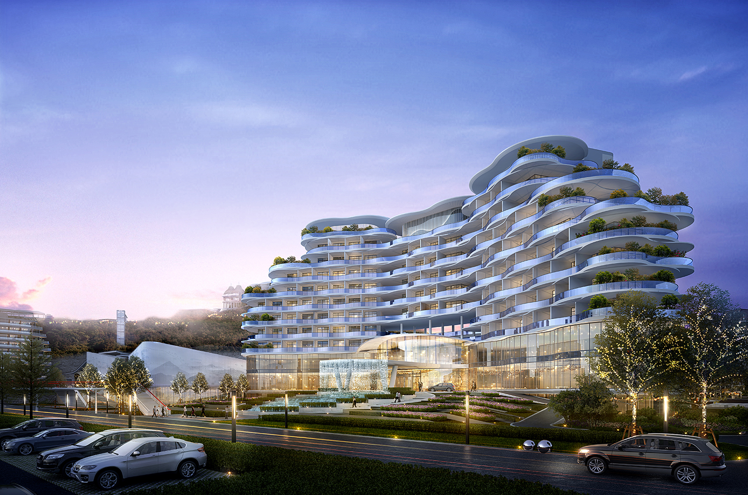 項(xiàng)目采取“一環(huán)雙核,一廊兩軸,多節(jié)點(diǎn),五大功能片區(qū)”的規(guī)劃形式。其中,南區(qū)以道路及山體為界,規(guī)劃形成五大功能片區(qū):絲路?琳瑯里、絲路?一千零一夜、絲路?云端溫泉海、絲路?甘泉谷和絲路?駝鈴灣。酒店位于“絲路?一千零一夜”片區(qū),結(jié)合絲路60國(guó)文旅論壇永久會(huì)址(國(guó)際會(huì)議中心)、溫泉服務(wù)中心(中國(guó)鹽鹵溫泉博覽館)、溫泉親子度假公寓、藝術(shù)之家(演出用品商場(chǎng)、演員公寓、商務(wù)酒店)等,打造成為奇域小鎮(zhèn)內(nèi)部的酒店會(huì)議集群。建筑以“絲綢之路”為主題進(jìn)行創(chuàng)作,既體現(xiàn)地域特色,又與歷史文化交融積淀,構(gòu)成過(guò)去與現(xiàn)代的共生,衍生出豐富多彩的建筑風(fēng)貌。同時(shí),建筑采用獨(dú)特的地貌紋理,提煉出作為建筑表皮元素與圖案的鮮明文化符號(hào)。