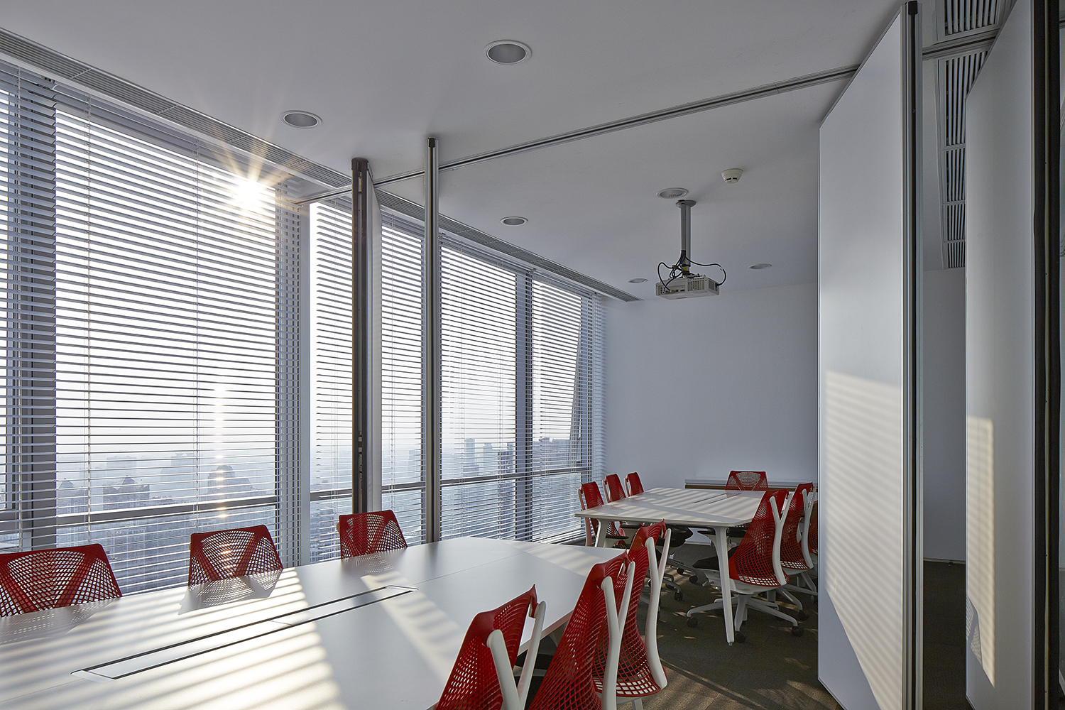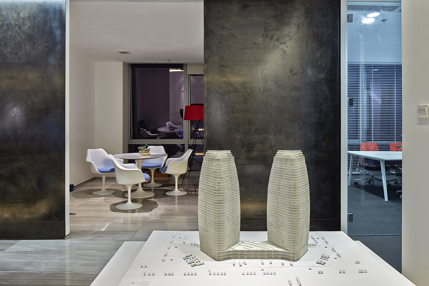 科技:32:9的超級(jí)寬屏、移動(dòng)終端與投影的無線對(duì)接、LOOKING THOUGH(透視視屏)技術(shù)的展示運(yùn)用、電子白板的普及……全新技術(shù)及設(shè)備的引入,為本案設(shè)計(jì)不管是在技術(shù)程度、工作效率、行業(yè)前瞻性方面都樹立了業(yè)界新的高度。