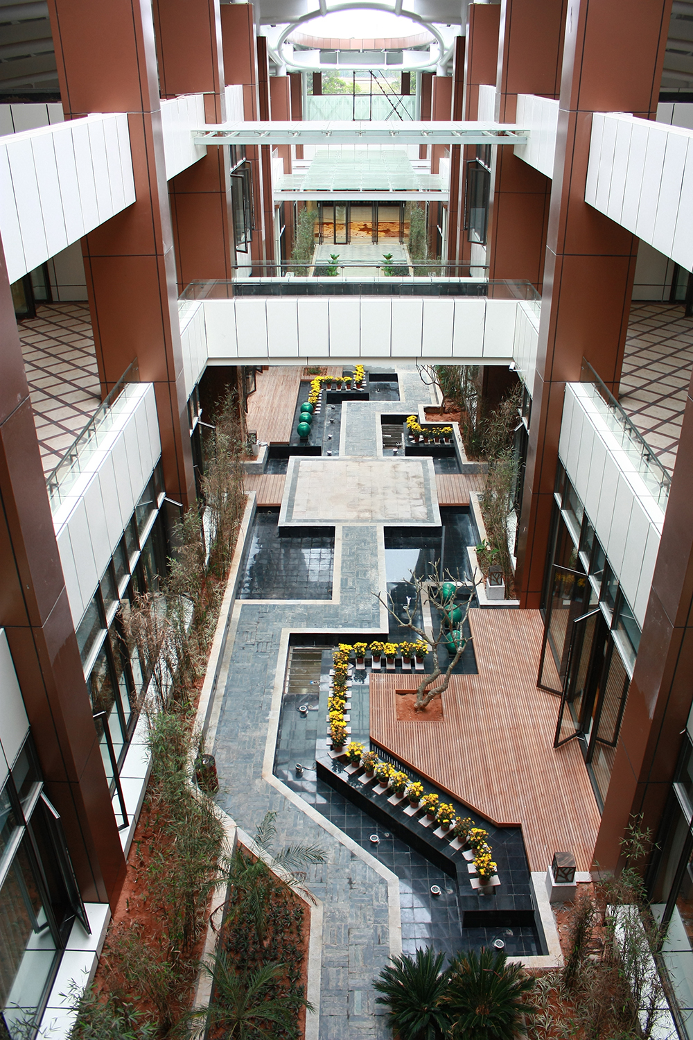 三亞鳳凰國際機(jī)場貴賓航站樓處于機(jī)場相對獨(dú)立的區(qū)域,極具動(dòng)感張力,好似海浪、帳篷般的建筑形態(tài),富有嶺南新中式風(fēng)情的室內(nèi)裝飾手法,無不彰顯貴賓航站樓的吸引力。因此,景觀營造采取內(nèi)向型的設(shè)計(jì)方向,與建筑、室內(nèi)相輔相成,創(chuàng)造出航站樓環(huán)境與機(jī)場大環(huán)境相互交流、和諧共生的空間藝術(shù)。一系列的新中式園區(qū),提升了航站樓的空間品質(zhì),人們仿佛置身于寧靜而舒適的中國傳統(tǒng)庭園之中。