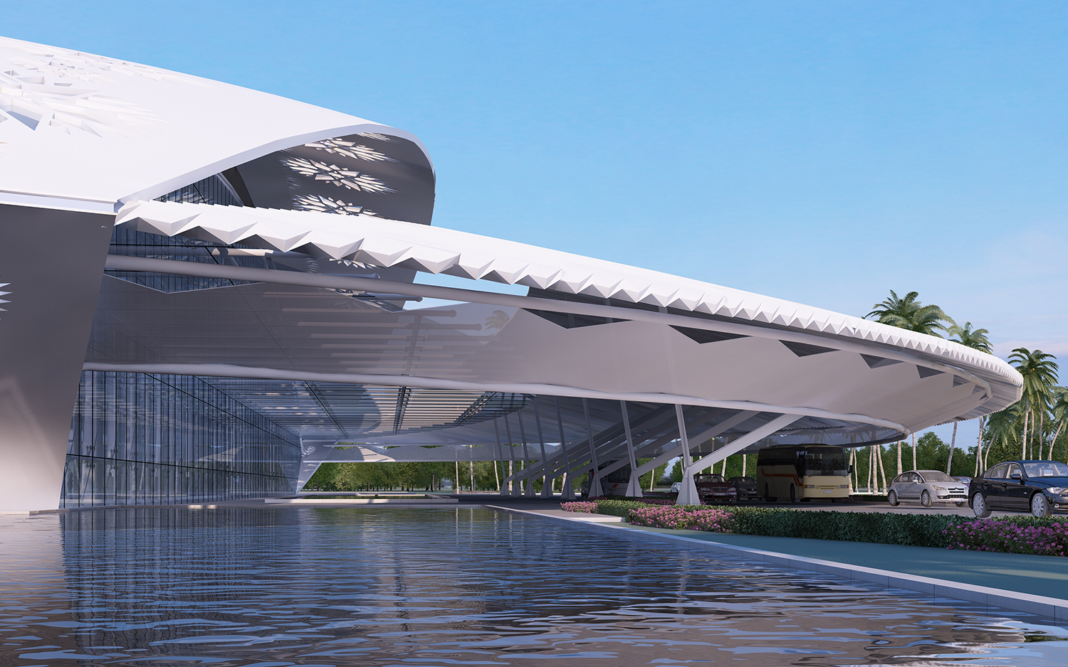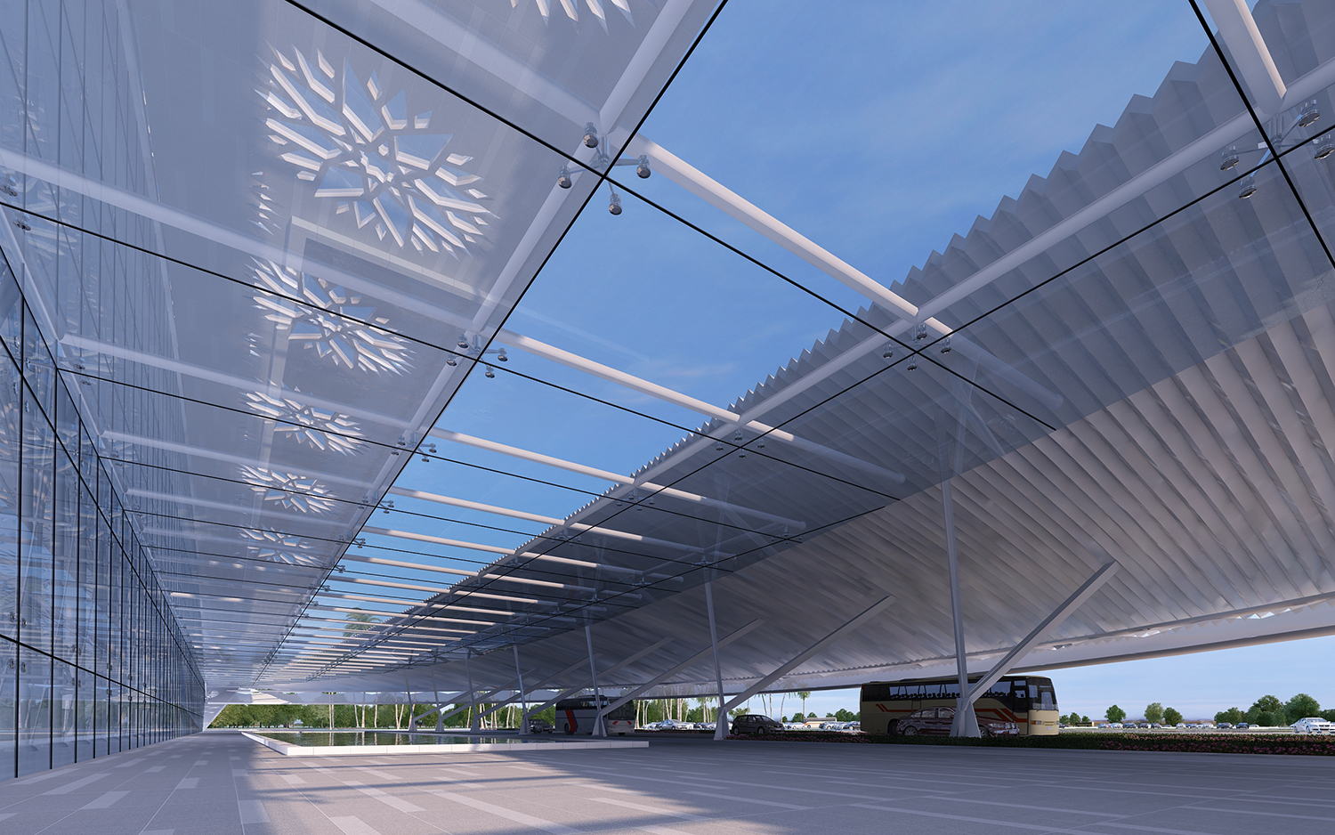 博鰲空港猶如玉帶灘上靜待千年的玉貝,安靜優(yōu)雅的展開它包容的空間,迎接四面八方的賓客,展示著博鰲積極向上,海納百川的精神。兩個(gè)完整圓球相交形成如天外來客版的航站樓空間,切割后形成的單純簡(jiǎn)潔的體量又仿如潔白的貝殼,給人無限遐想。淺水景的設(shè)計(jì),為建筑提供了一個(gè)寧靜幽雅的外部環(huán)境,使建筑猶如漂浮在水面上的雕塑般優(yōu)雅動(dòng)人?!柏悮ぁ蓖獗砀采w的華麗花紋如蛋殼雕刻一般的剔透玲瓏,海邊溫暖和煦的陽光如緩緩降落的蒲公英般繽紛地灑落在室內(nèi)每一個(gè)角落。步入航站樓,猶如進(jìn)入一個(gè)純凈潔白的樹林,樹狀的結(jié)構(gòu)系統(tǒng)在航站樓里優(yōu)雅的支撐著我們蒼穹般的屋頂,春暖花開的大海氣息撲面而來。
