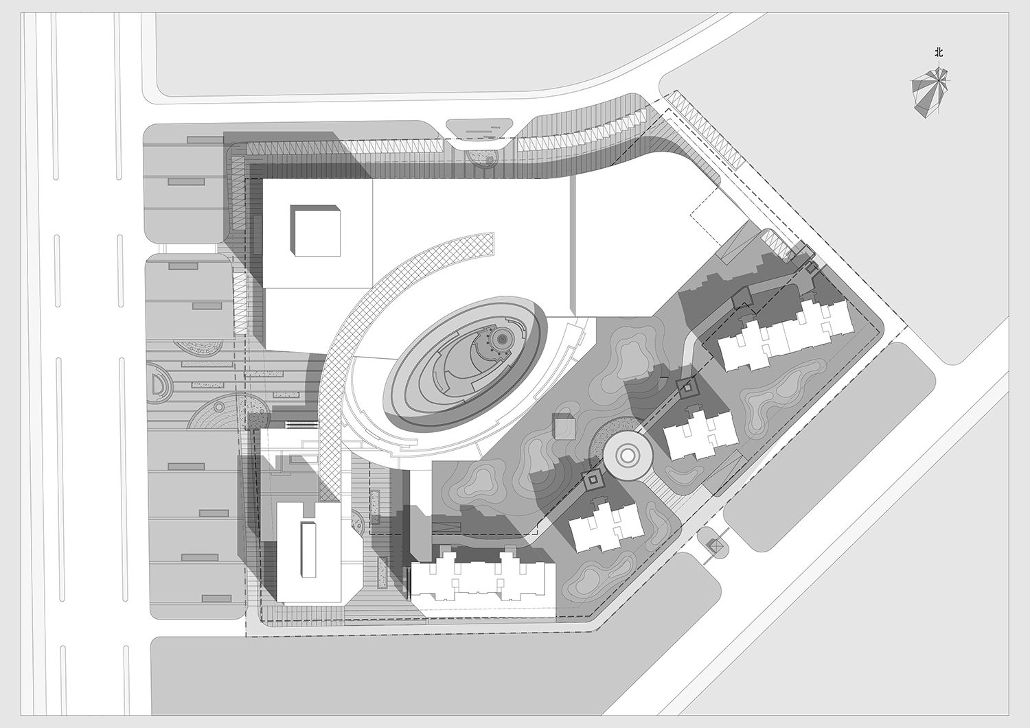 項(xiàng)目主體建筑為一棟160米高的甲級寫字樓和4萬平米的商業(yè)裙房。 寫字樓標(biāo)準(zhǔn)層面積為2,000平方米,設(shè)計(jì)層高為4米。 塔樓的立面材料為虛實(shí)對比的幕墻體系,并引入外墻燈光體系。為了使商業(yè)面積最大化的利用,在裙房的內(nèi)部設(shè)計(jì)一橢圓形中庭。 中庭的設(shè)置起到了拉動(dòng)和聚集商業(yè)人氣的作用,并且使沿中庭的商業(yè)價(jià)值得以大幅提升。 項(xiàng)目必將成為長春新區(qū)的都市標(biāo)桿。