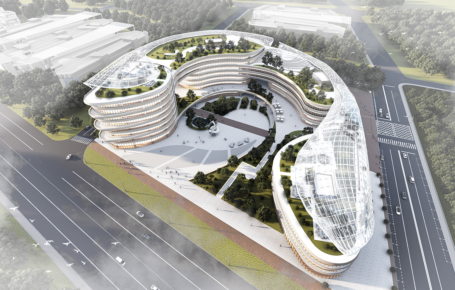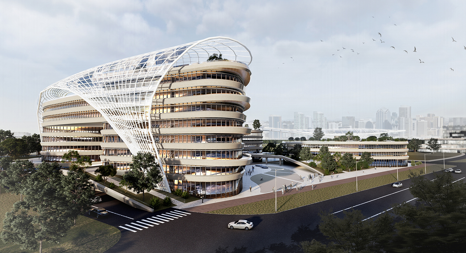 人是城市行為的主體,建筑是人類活動的場所,人的感受是做建筑設(shè)計(jì)需要考慮的核心。清遠(yuǎn)以鳳為名,顧名思義又稱“鳳城”,是依山而居,因水而興的美麗城市。項(xiàng)目依托城市自然風(fēng)貌,以“筑巢引鳳、山水之城”作為設(shè)計(jì)理念,讓人與自然在城市中和諧相處。項(xiàng)目摒棄了冷冰冰的千城一面式建筑,將公園和建筑融為一體,形成了極好的空間體驗(yàn),創(chuàng)造充滿文化感,能夠鏈接自然與人類情感的建筑。