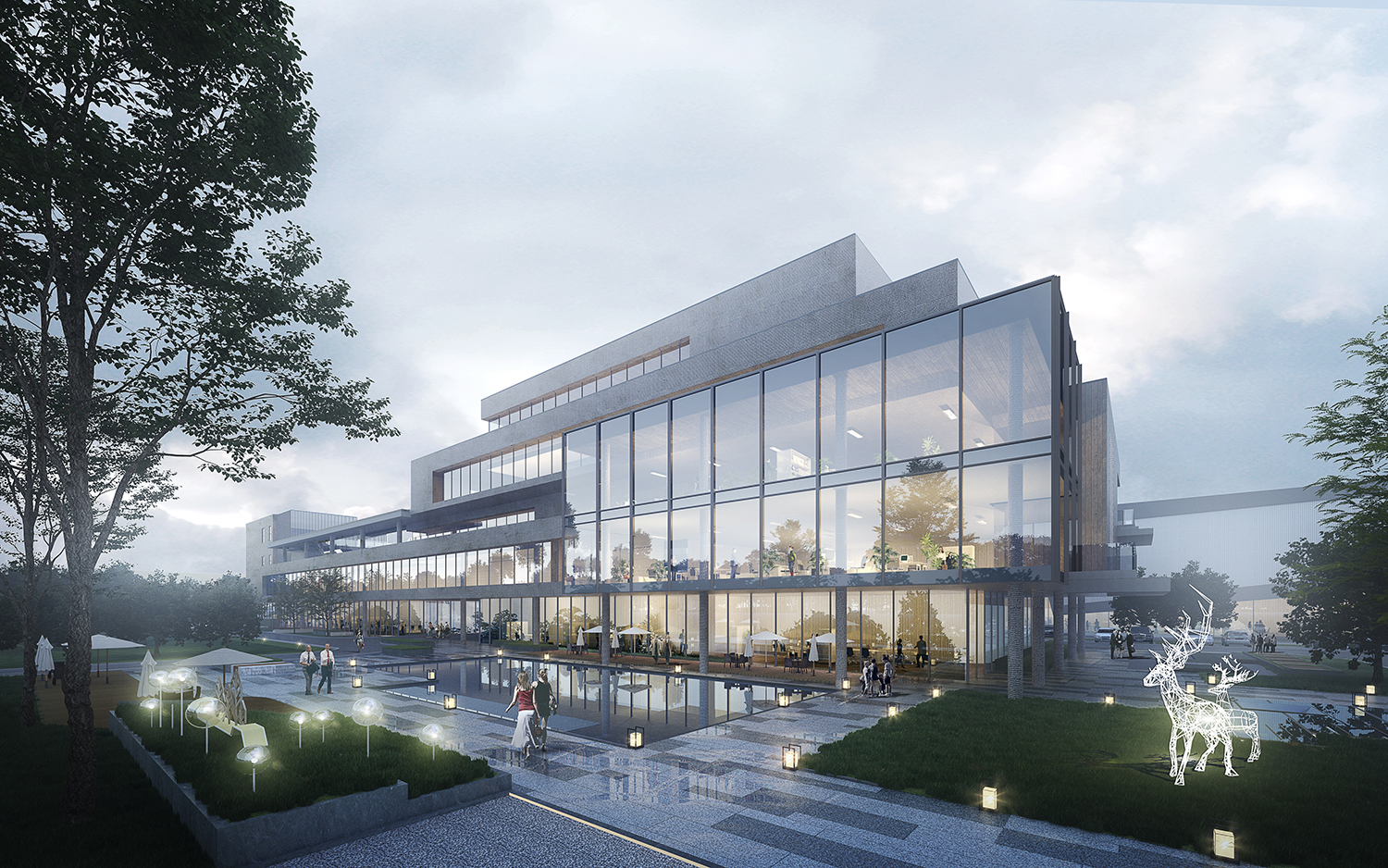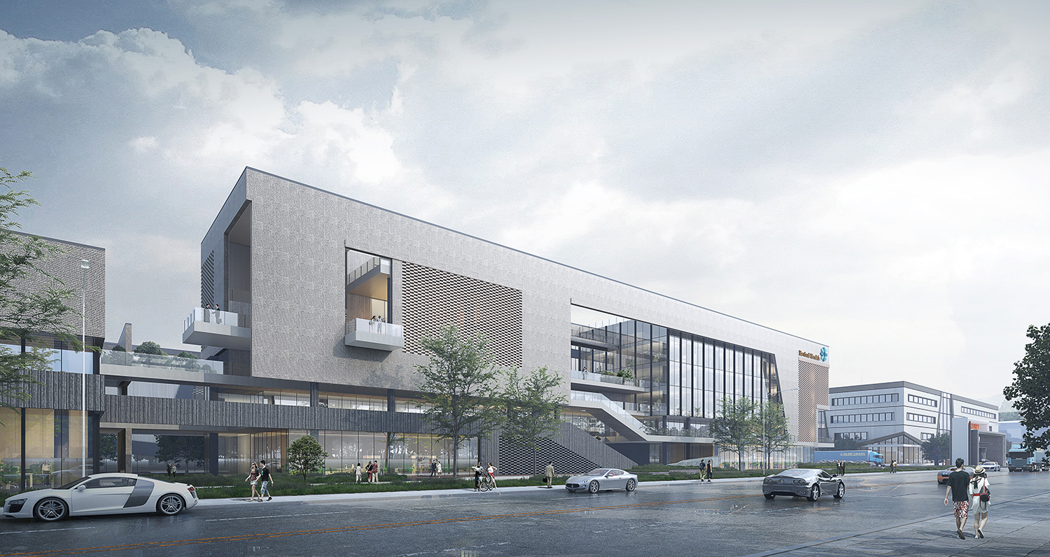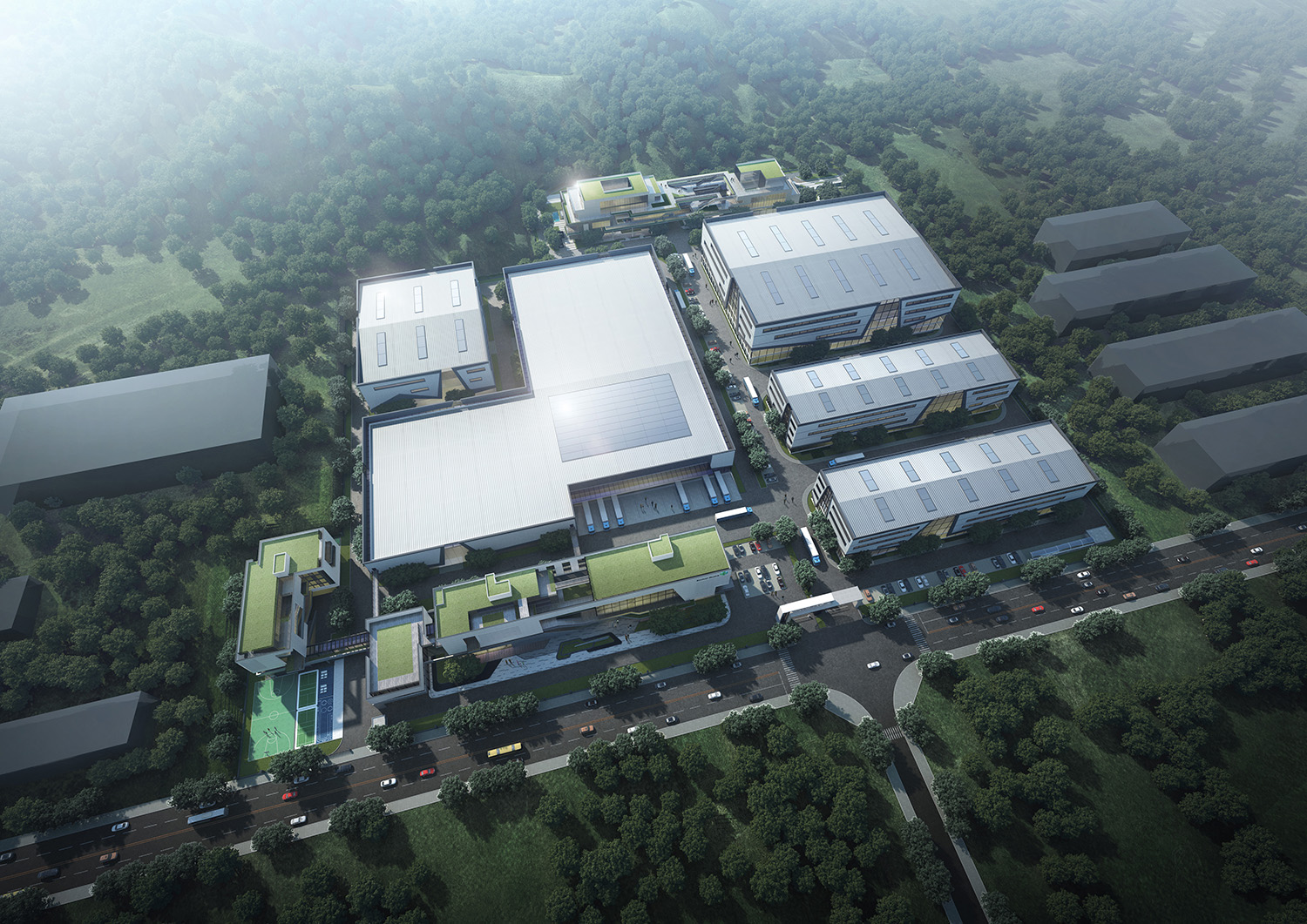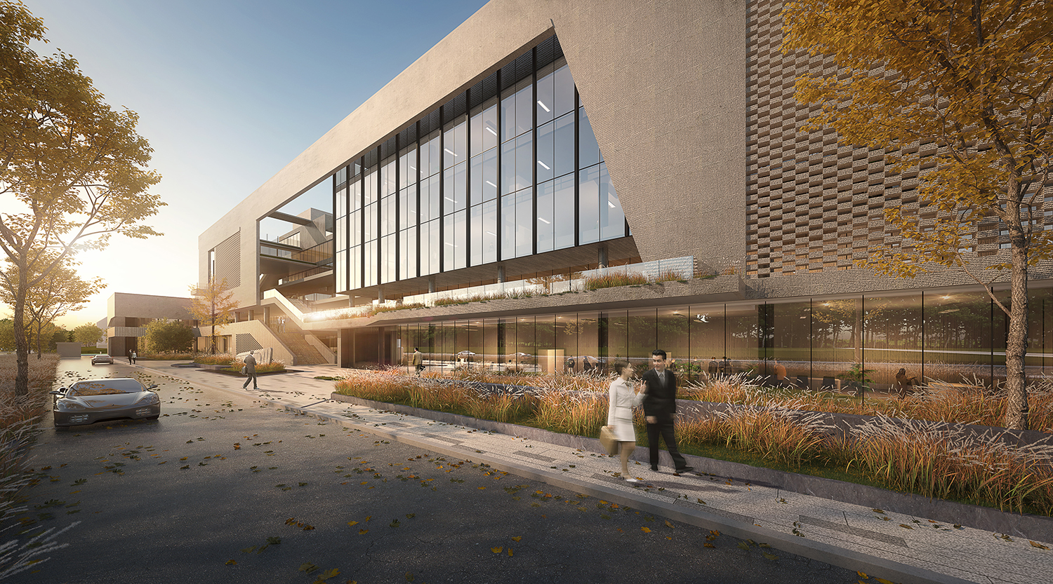 項目位于江西宜春市袁州區(qū),園區(qū)建筑包括多層綜合樓、研發(fā)生產(chǎn)樓、宿舍、廠房等。園區(qū)內(nèi)建筑采用現(xiàn)代風格元素塑造高端企業(yè)的整體形象,辦公樓建筑立面采用石材加玻璃幕墻整體設(shè)計。研發(fā)樓層層退臺,與南面枯山形成體塊呼應(yīng)關(guān)系。廠房立面根據(jù)線條上下波動,形成有韻律建筑氛圍。廠房的采光設(shè)計采取一層大面積玻璃幕墻及屋頂開窗的采光方式,使得較大體量的廠房采光得以解決。