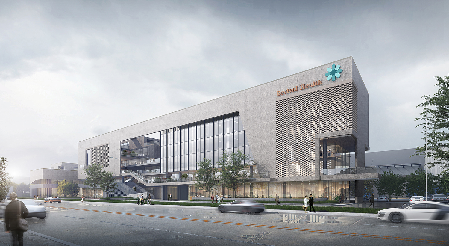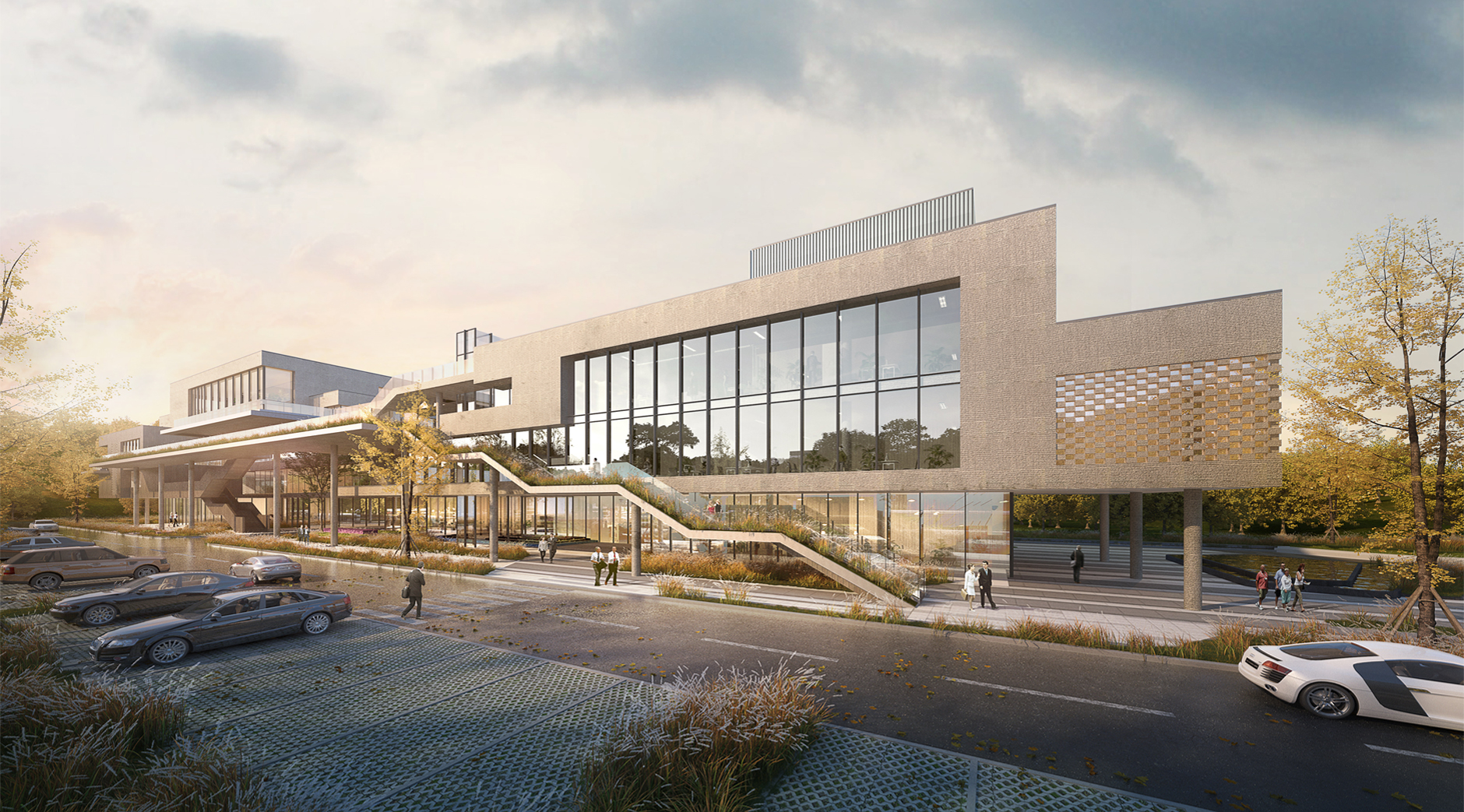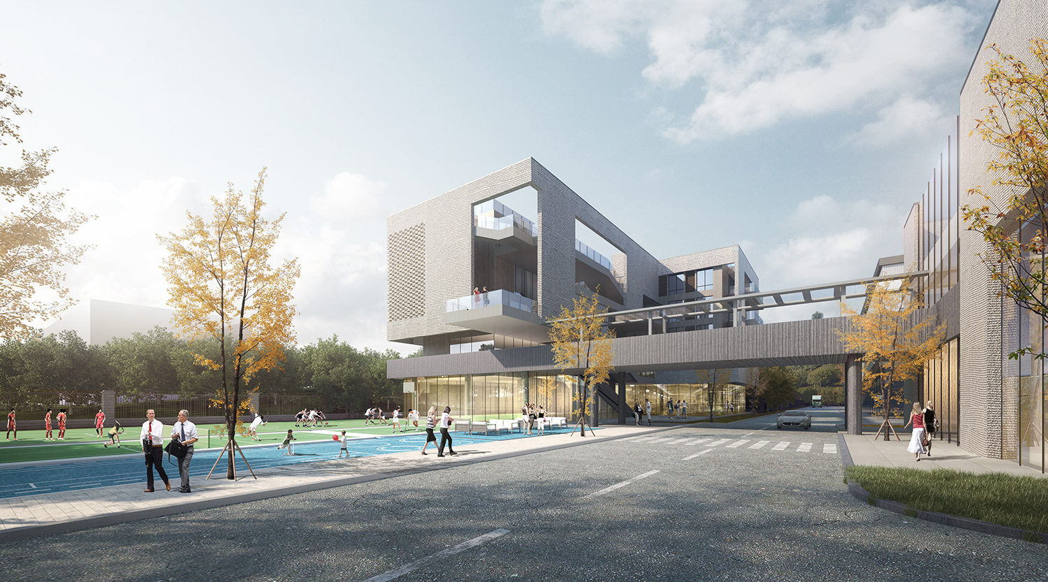 項目位于江西宜春市袁州區(qū),園區(qū)建筑包括多層綜合樓、研發(fā)生產(chǎn)樓、宿舍、廠房等。園區(qū)內(nèi)建筑采用現(xiàn)代風格元素塑造高端企業(yè)的整體形象,辦公樓建筑立面采用石材加玻璃幕墻整體設(shè)計。研發(fā)樓層層退臺,與南面枯山形成體塊呼應(yīng)關(guān)系。廠房立面根據(jù)線條上下波動,形成有韻律建筑氛圍。廠房的采光設(shè)計采取一層大面積玻璃幕墻及屋頂開窗的采光方式,使得較大體量的廠房采光得以解決。
