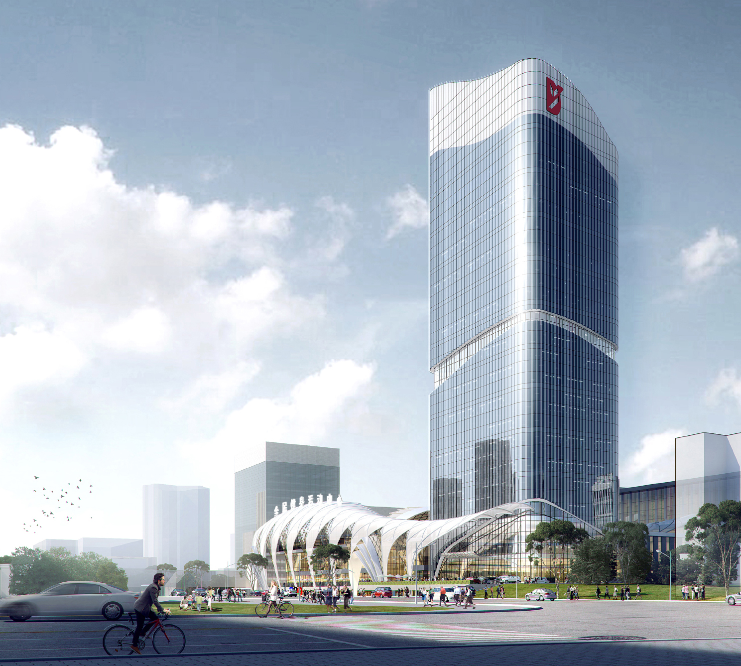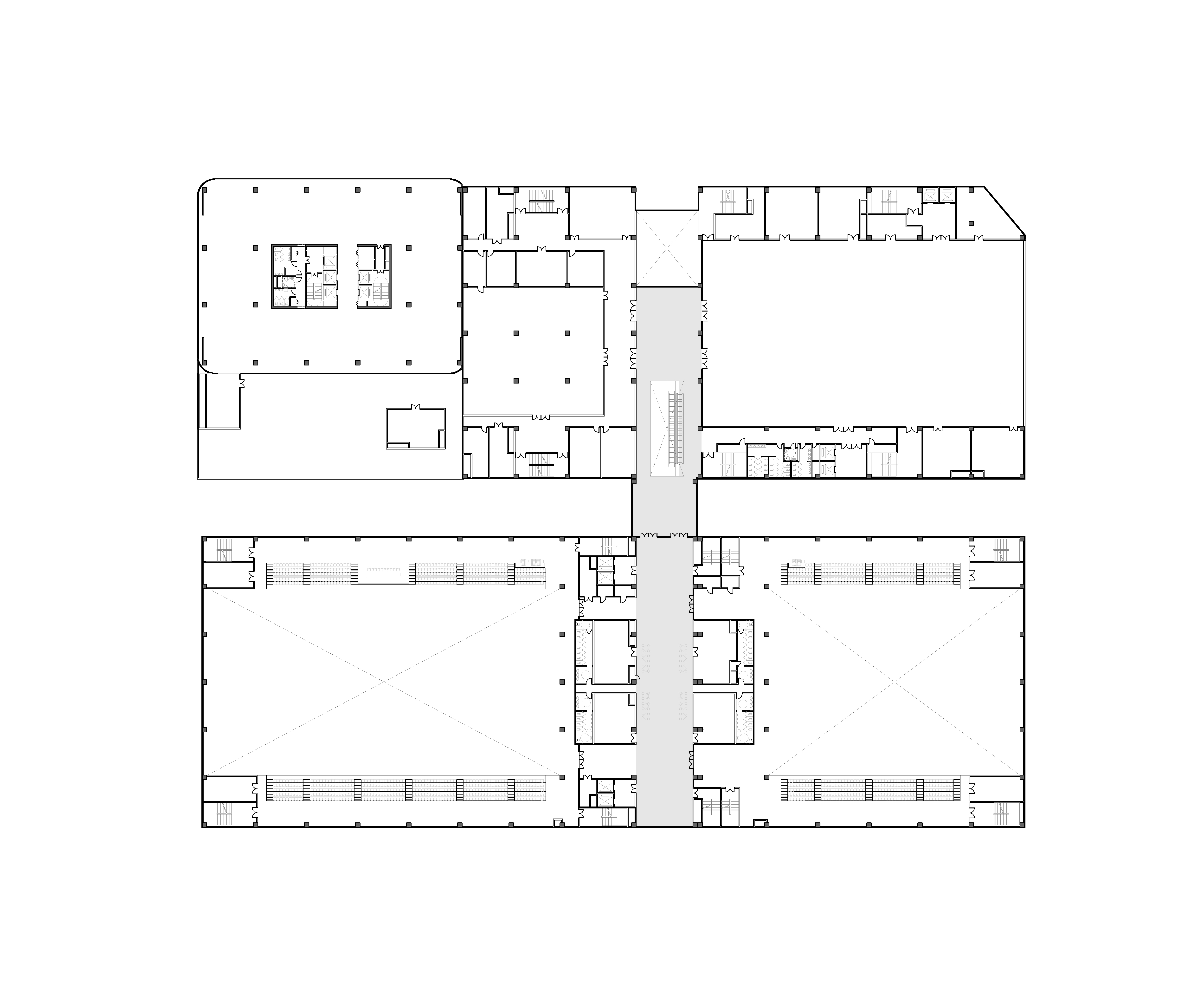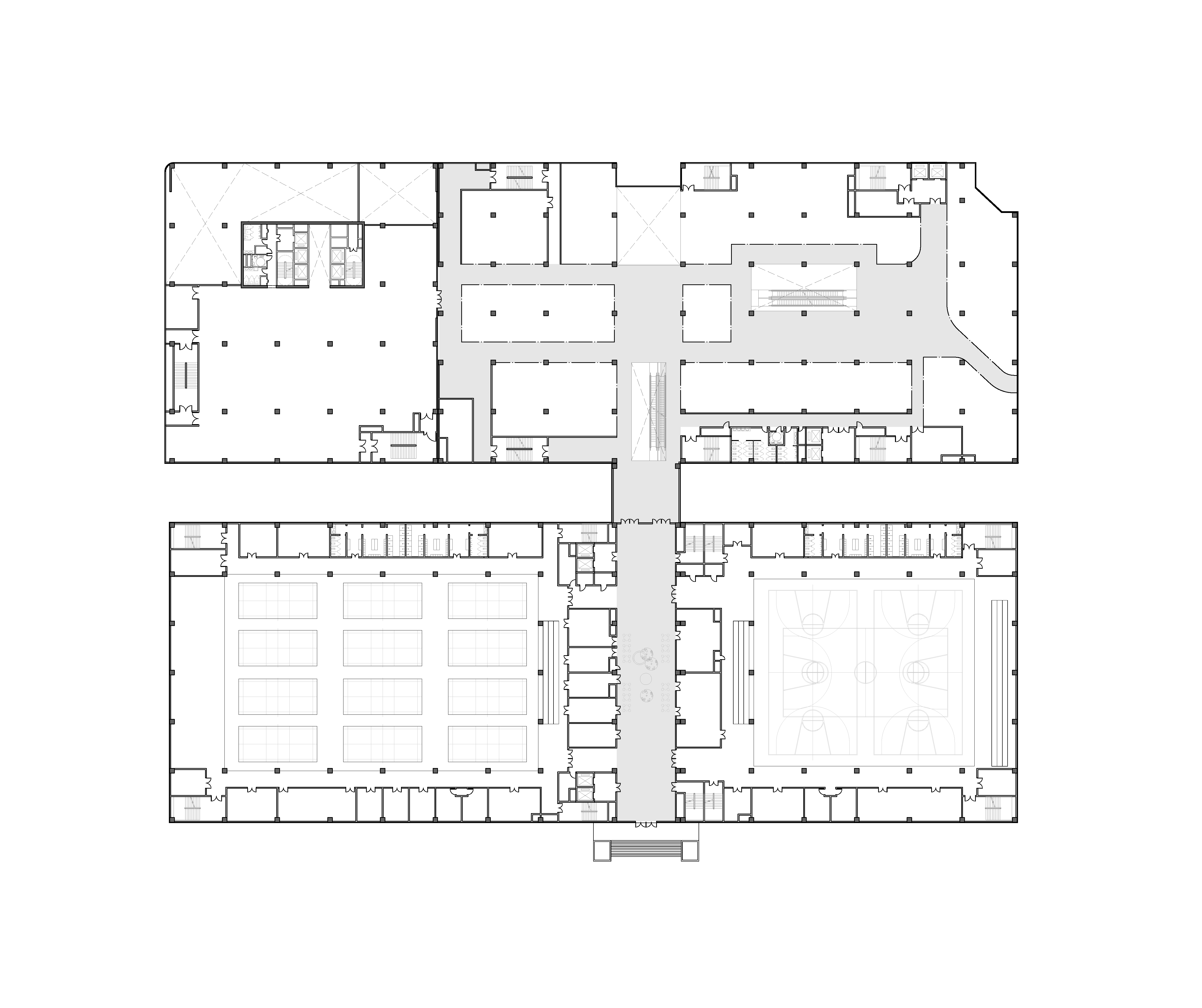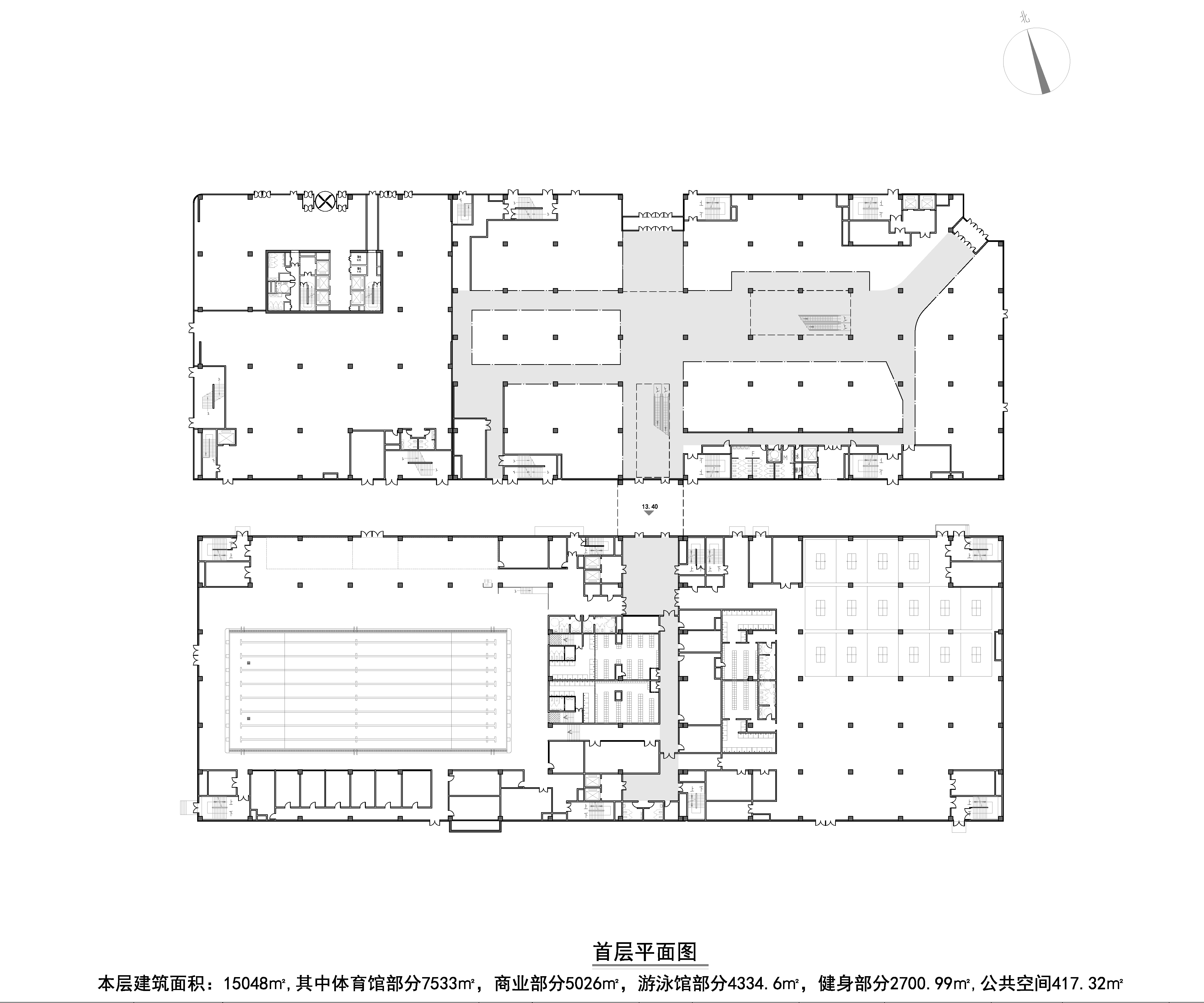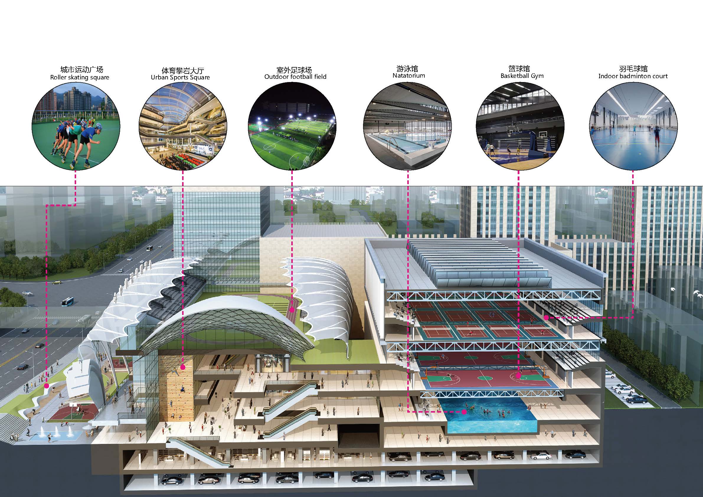 煙臺(tái)市全民健身中心是一座綜合性的全民健身館和購(gòu)物中心的結(jié)合,由內(nèi)外兼顧、分區(qū)明確并聯(lián)系方便的一組完整的建筑空間組成,通過(guò)公共空間聯(lián)通到北側(cè)開(kāi)放的體育文化休閑廣場(chǎng)。其中羽毛球館與籃球館對(duì)于內(nèi)部空間高度有特殊要求,設(shè)置于健身中心的南側(cè),兩層通高設(shè)計(jì),并在每一層設(shè)置休息區(qū)與更衣淋浴室等配套功能,與北側(cè)的購(gòu)物中心通過(guò)體育大廳相結(jié)合,使其形成一個(gè)大型的體育文化購(gòu)物中心,人們游走其中,或運(yùn)動(dòng)、或休憩,成為煙臺(tái)市民健身娛樂(lè)、運(yùn)動(dòng)休閑的好去處。