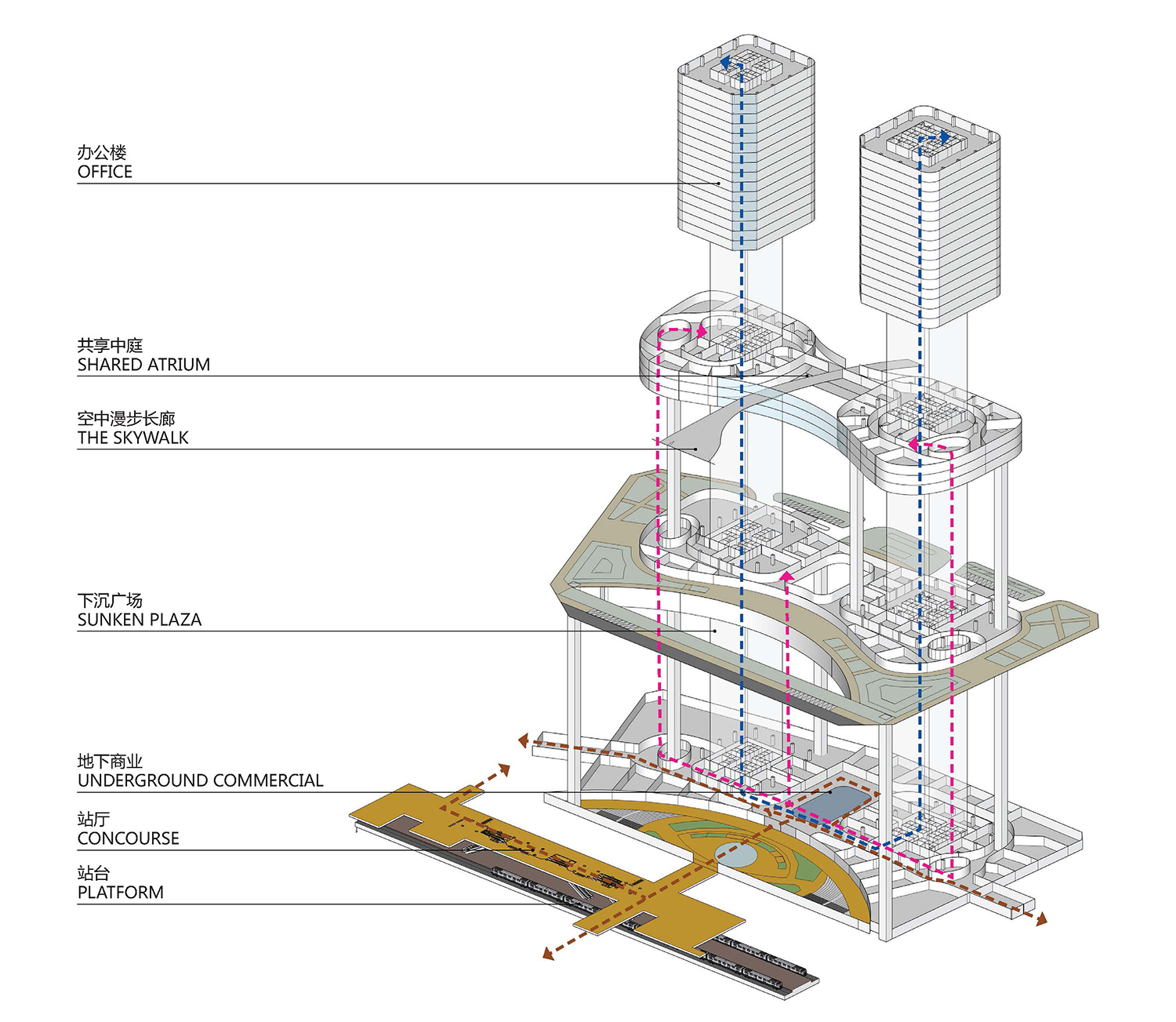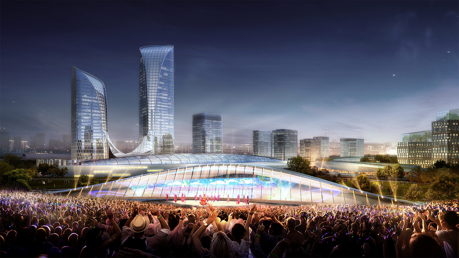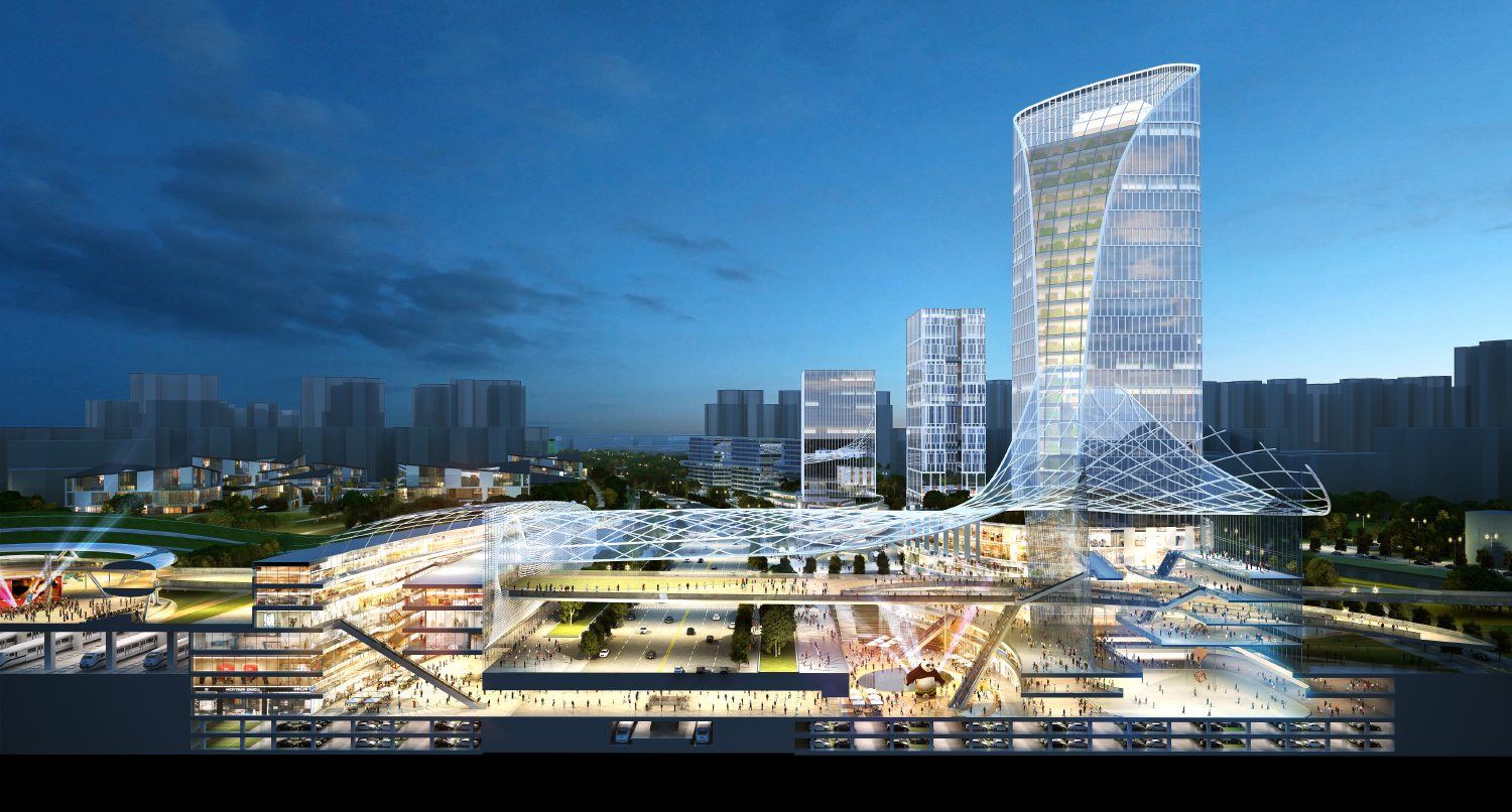 項(xiàng)目位于成都郫都區(qū),地處于北四環(huán)和成都第二繞城高速之間,距離市中心天府廣場(chǎng)僅有 27km,配套齊全,是成都最具土地利用價(jià)值的地塊之一。規(guī)劃設(shè)計(jì)立足于為郫都區(qū)打造一座“理想城”,重新定義品質(zhì)人文的出行生活方式。打破常規(guī)的封閉式站廳做法,破除封閉墻,將站廳與相連地塊地下空間相接,實(shí)現(xiàn)地鐵站廳層與周邊地塊便捷可達(dá)性,最大化的帶動(dòng)周邊地塊業(yè)態(tài)的價(jià)值。核心區(qū)以兩棟標(biāo)志性塔樓為主體,兩座塔樓傲然佇立于沱江河畔,空中廊橋如同一條瀑布順著兩座塔樓飛流直下,匯入地塊內(nèi)部,形成總部金融、商業(yè)街區(qū)、文創(chuàng)辦公、創(chuàng)新展示等多種業(yè)態(tài)。