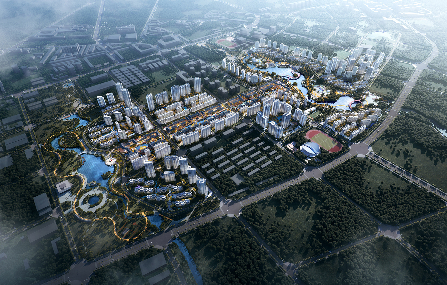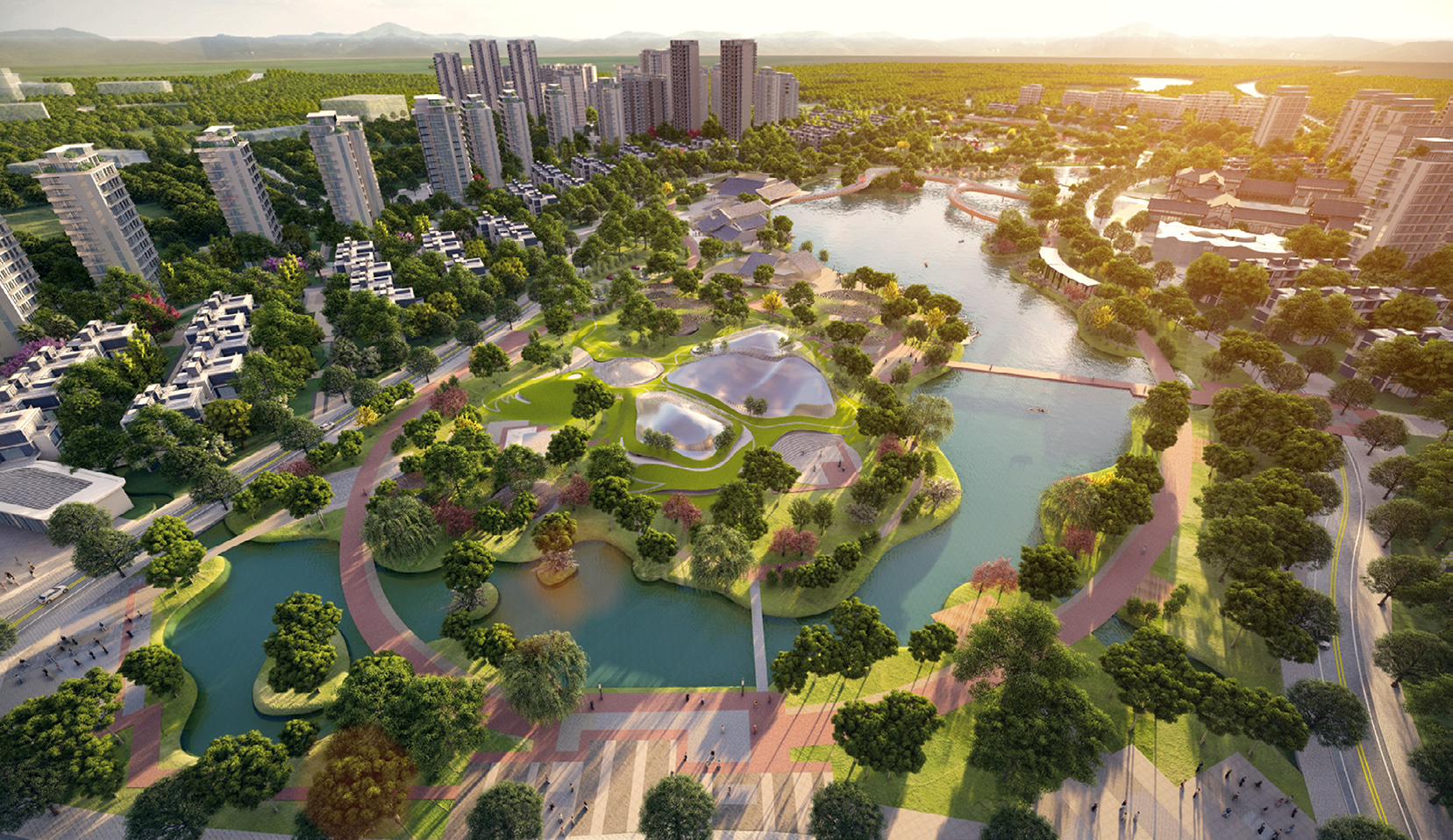 采用“織水融綠”的規(guī)劃原則,將濕地公園邊界滲透到社區(qū)內(nèi)部,讓景觀、水體穿插其間,創(chuàng)造國際化高品質(zhì)生態(tài)社區(qū),構(gòu)建一個宜人優(yōu)美的居住生態(tài)環(huán)境。用設(shè)計煥活濕地公園,融入全齡業(yè)態(tài),建設(shè)開放共享的城市公共空間。設(shè)置網(wǎng)紅打卡項目,打造一個多元生態(tài)化的微旅游目的地。
